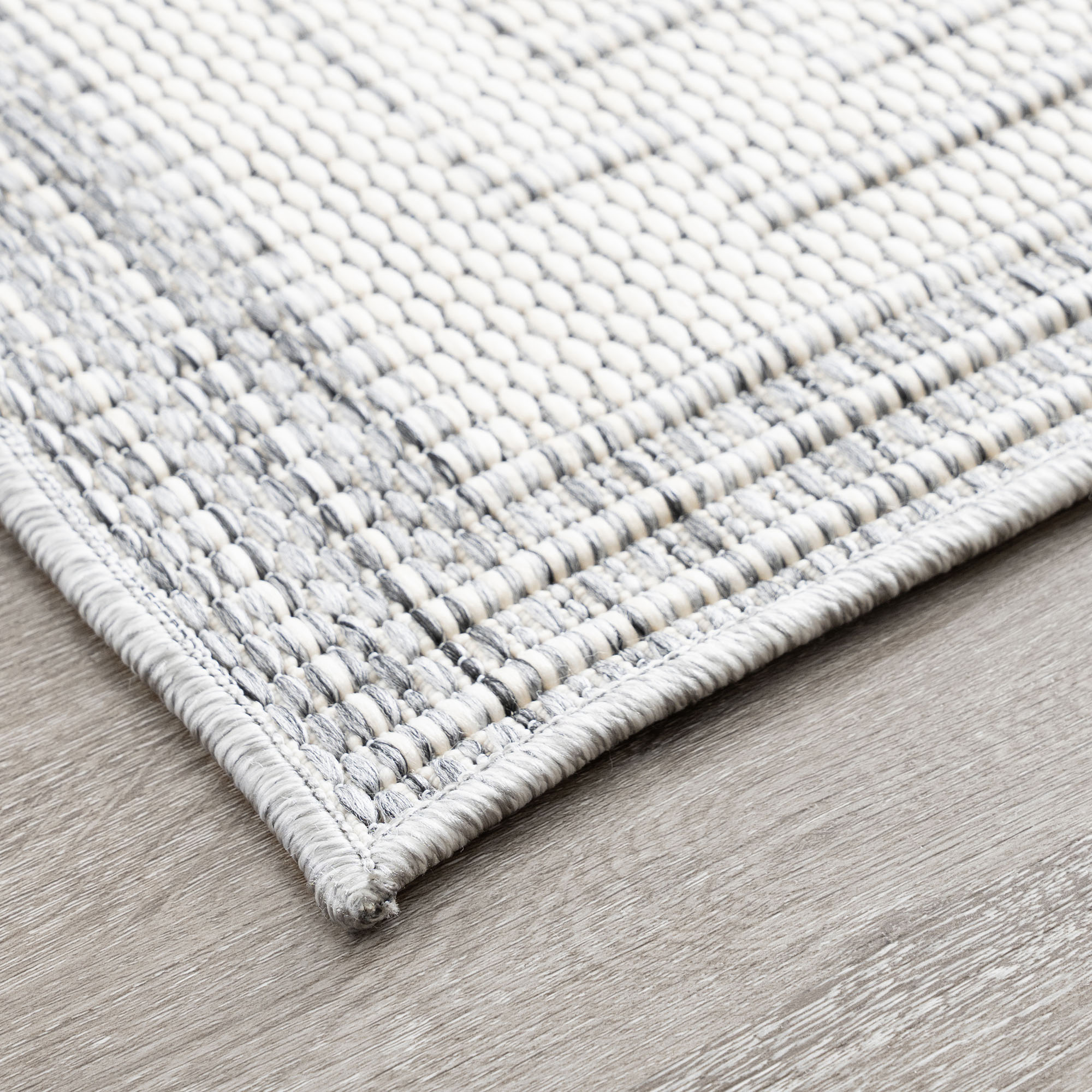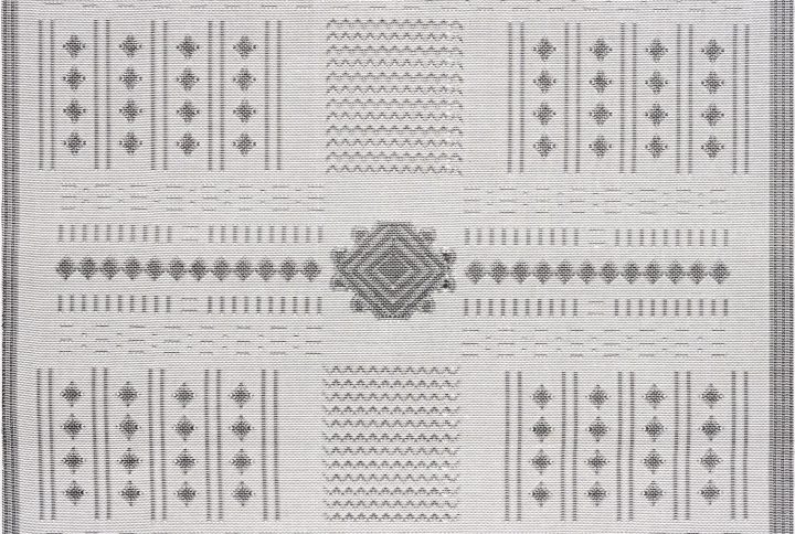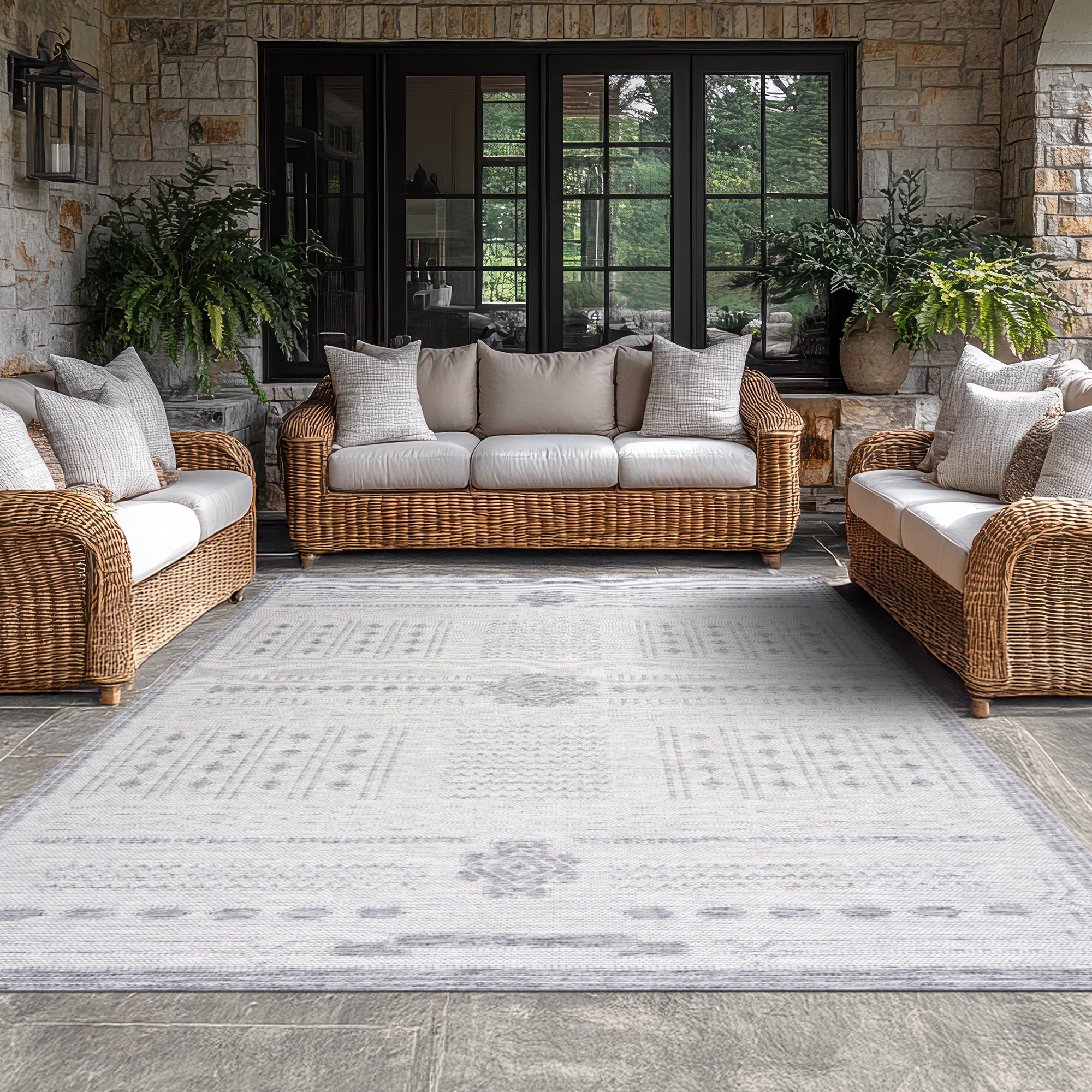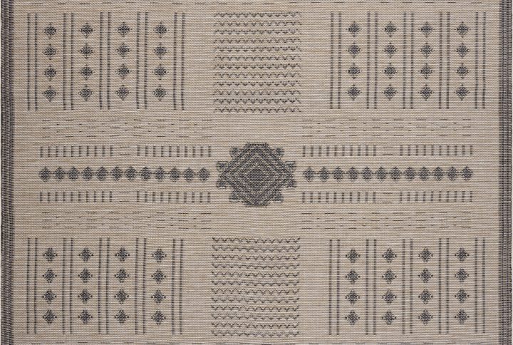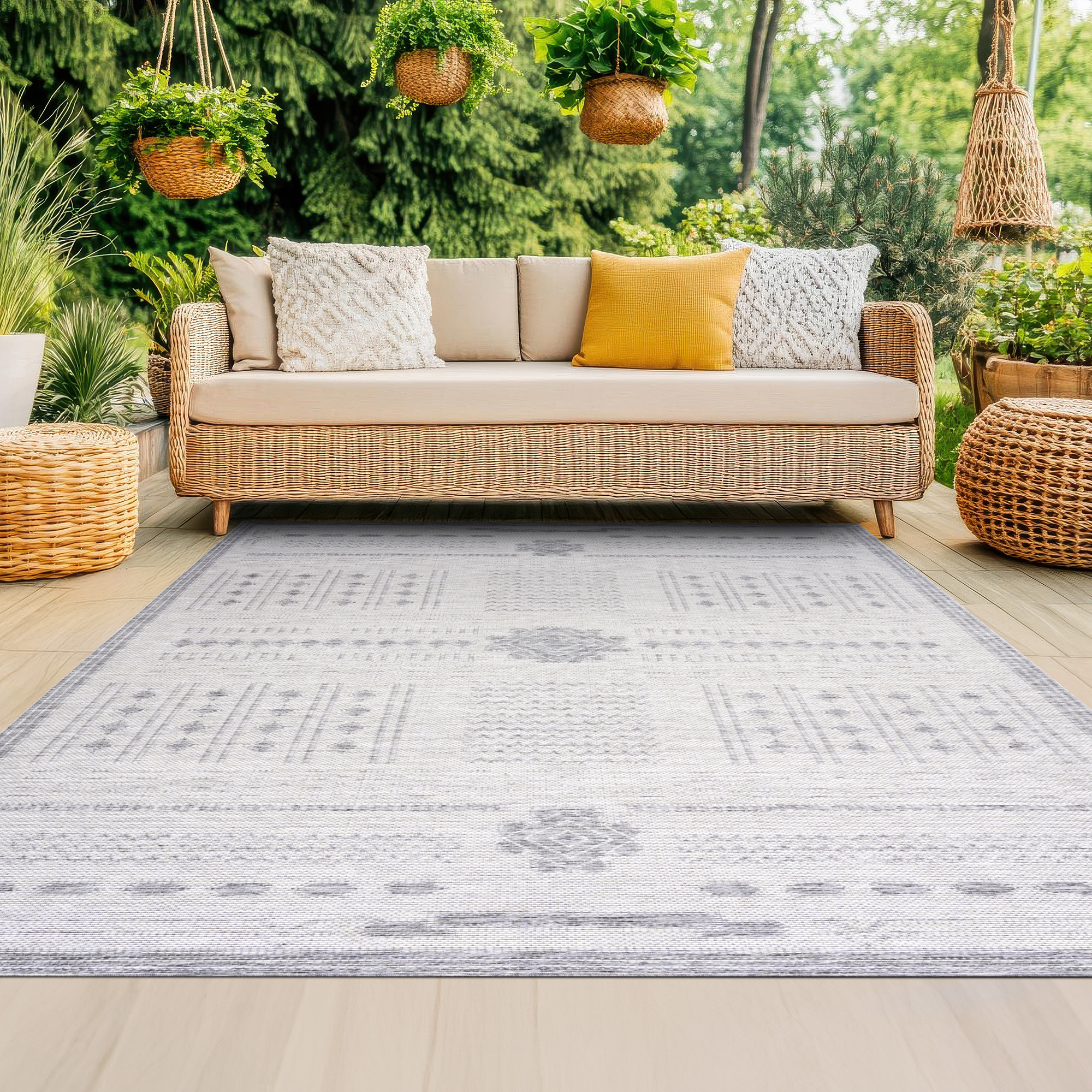 The design of this rug features a captivating avant-garde pattern, showcasing a unique blend of geometric shapes and abstract forms. The neutral tones dominate the palette, creating a sophisticated and versatile look that seamlessly integrates with various outdoor settings. These neutral hues contribute to a sense of modern sophistication while allowing the unique pattern to take center stage. The flatwoven texture adds depth and dimension to the rug, creating a visually stimulating yet harmonious effect. Sweep or vacuum without beater bar to remove debris. Clean outside with water from garden hose. Perfect for a balcony, courtyard, veranda, deck, mudroom, patio, porch, portico, or gazebo.
