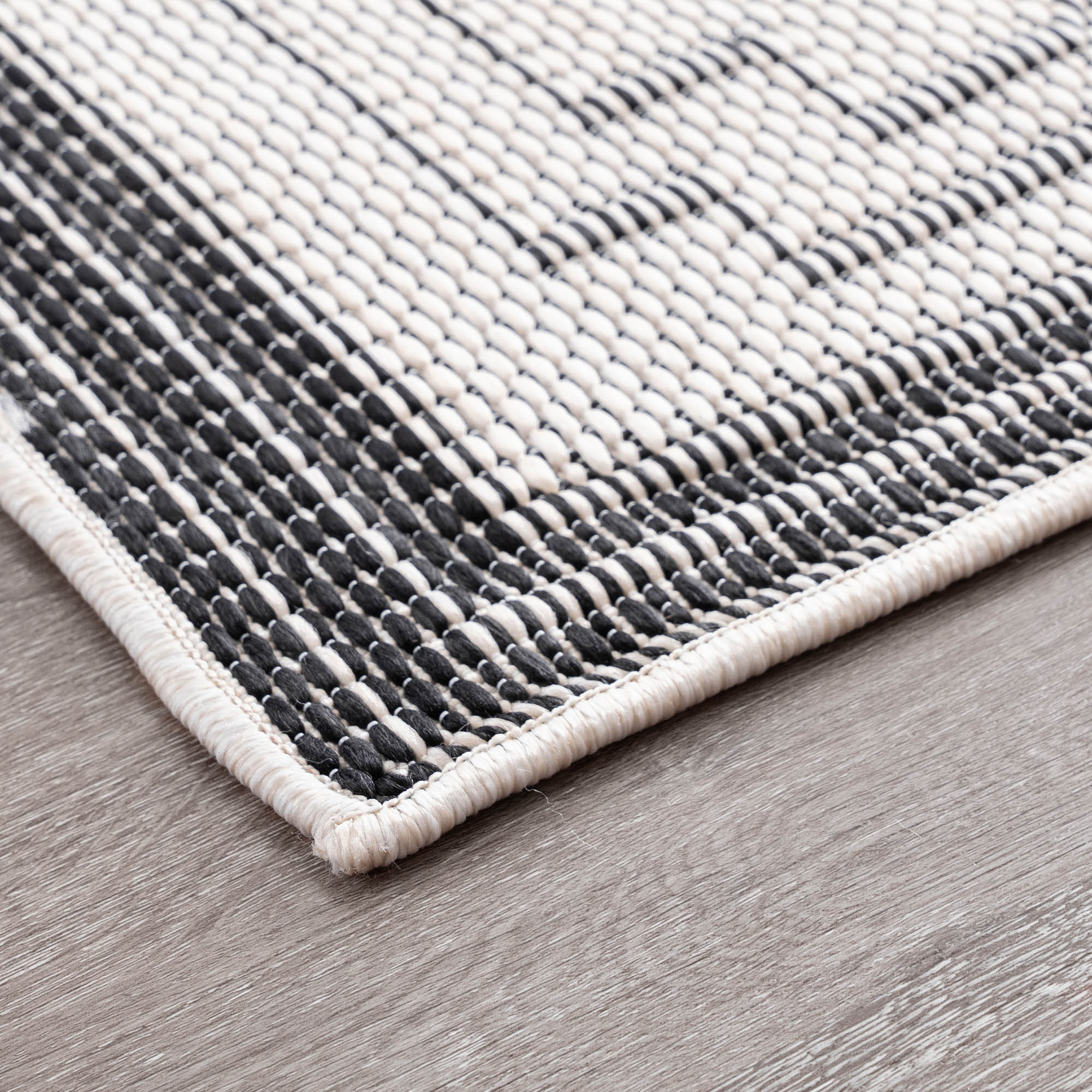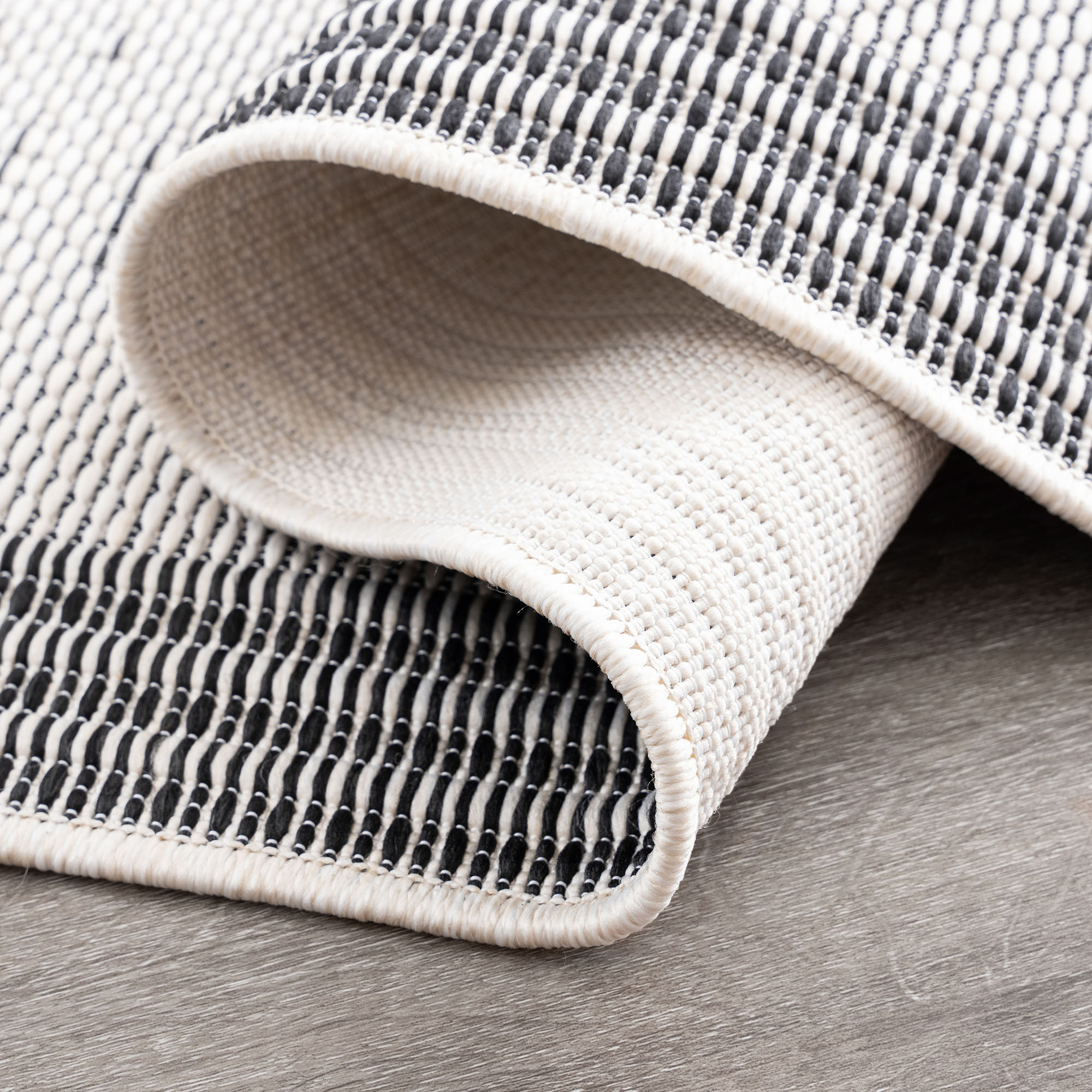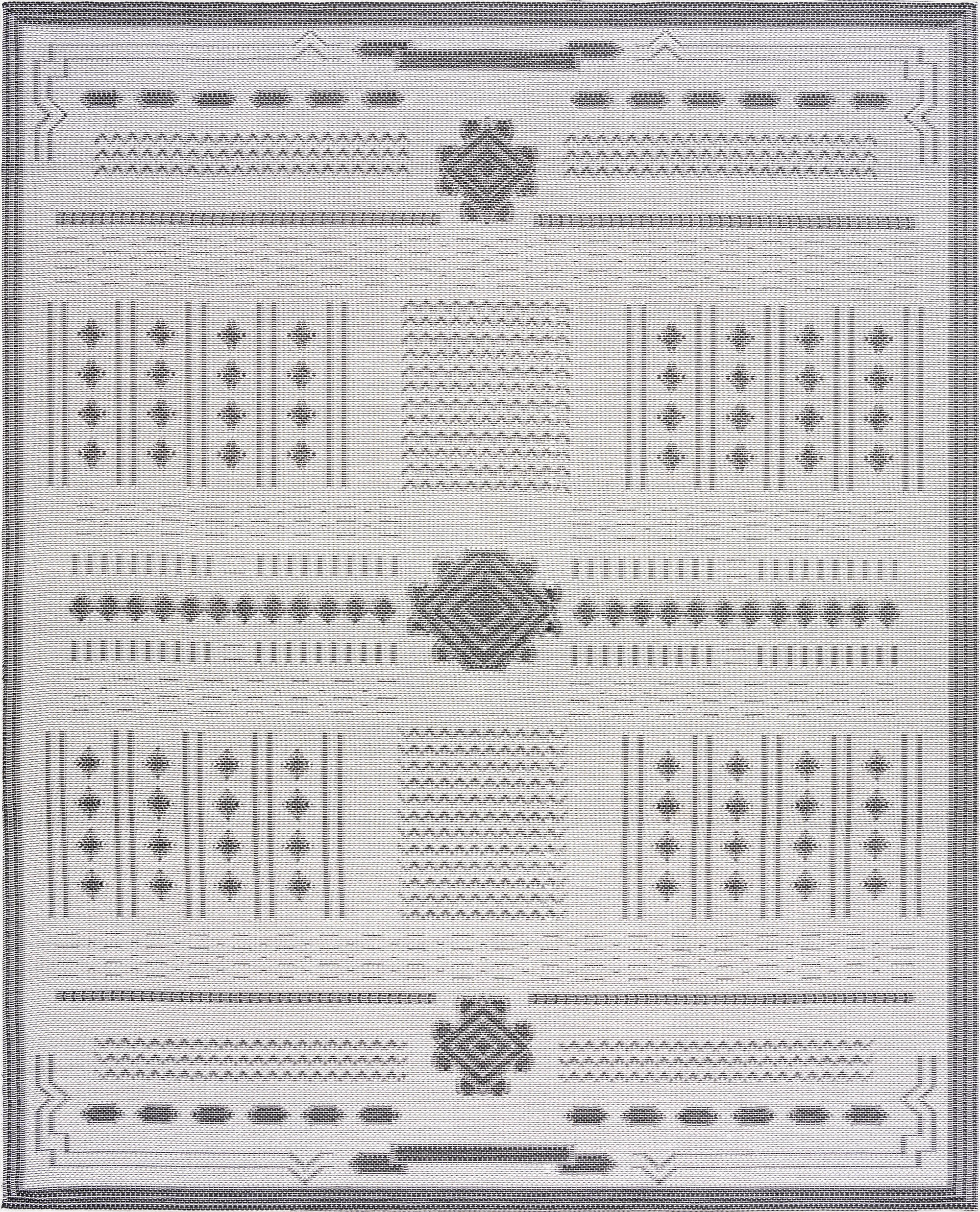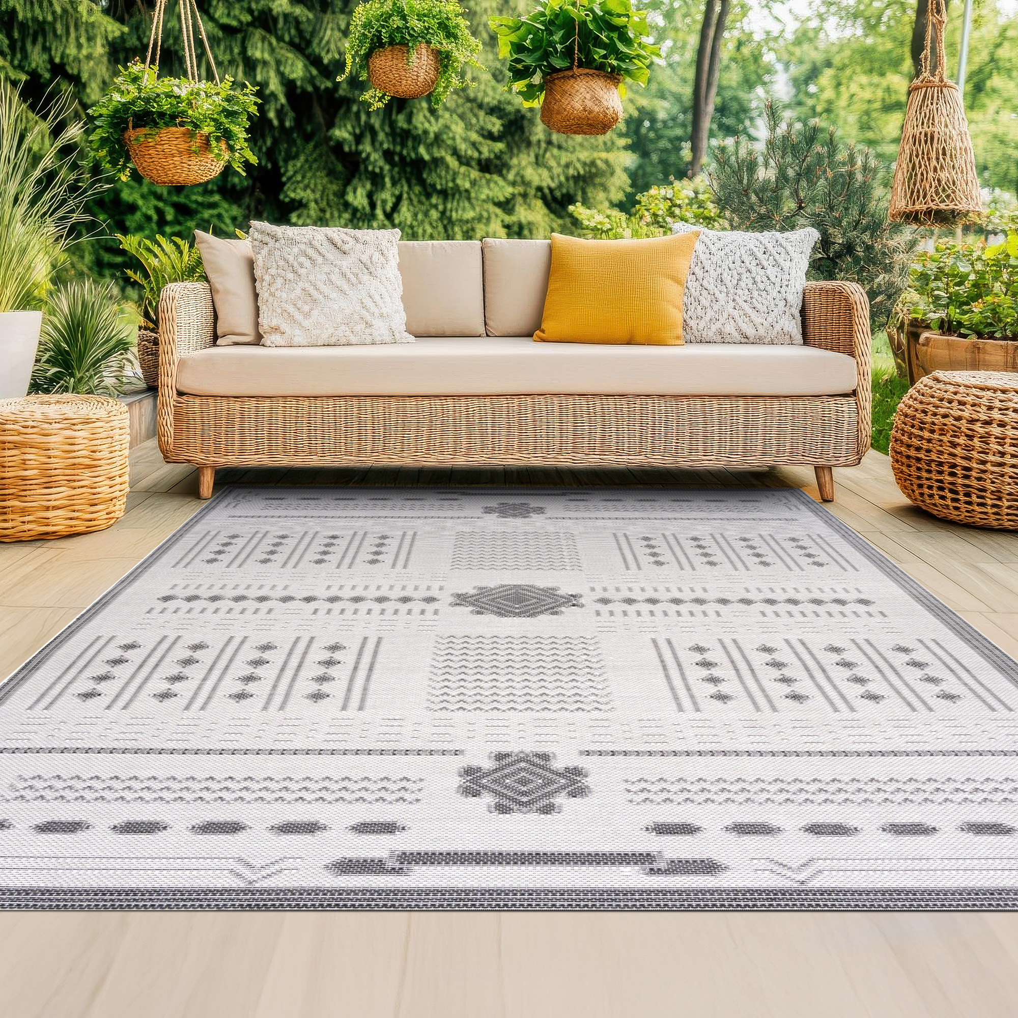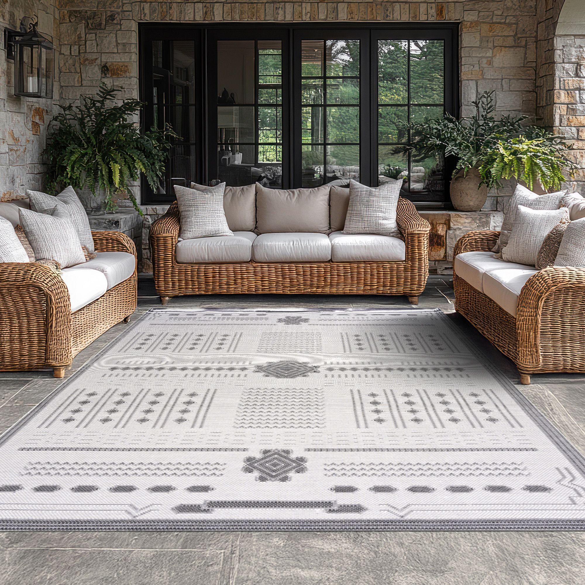 The design of this rug features a captivating avant-garde pattern, showcasing a unique blend of geometric shapes and abstract forms. The neutral tones dominate the palette, creating a sophisticated and versatile look that seamlessly integrates with various outdoor settings. These neutral hues contribute to a sense of modern sophistication while allowing the unique pattern to take center stage. The flatwoven texture adds depth and dimension to the rug, creating a visually stimulating yet harmonious effect. Sweep or vacuum without beater bar to remove debris. Clean outside with water from garden hose. Perfect for a balcony, courtyard, veranda, deck, mudroom, patio, porch, portico, or gazebo.