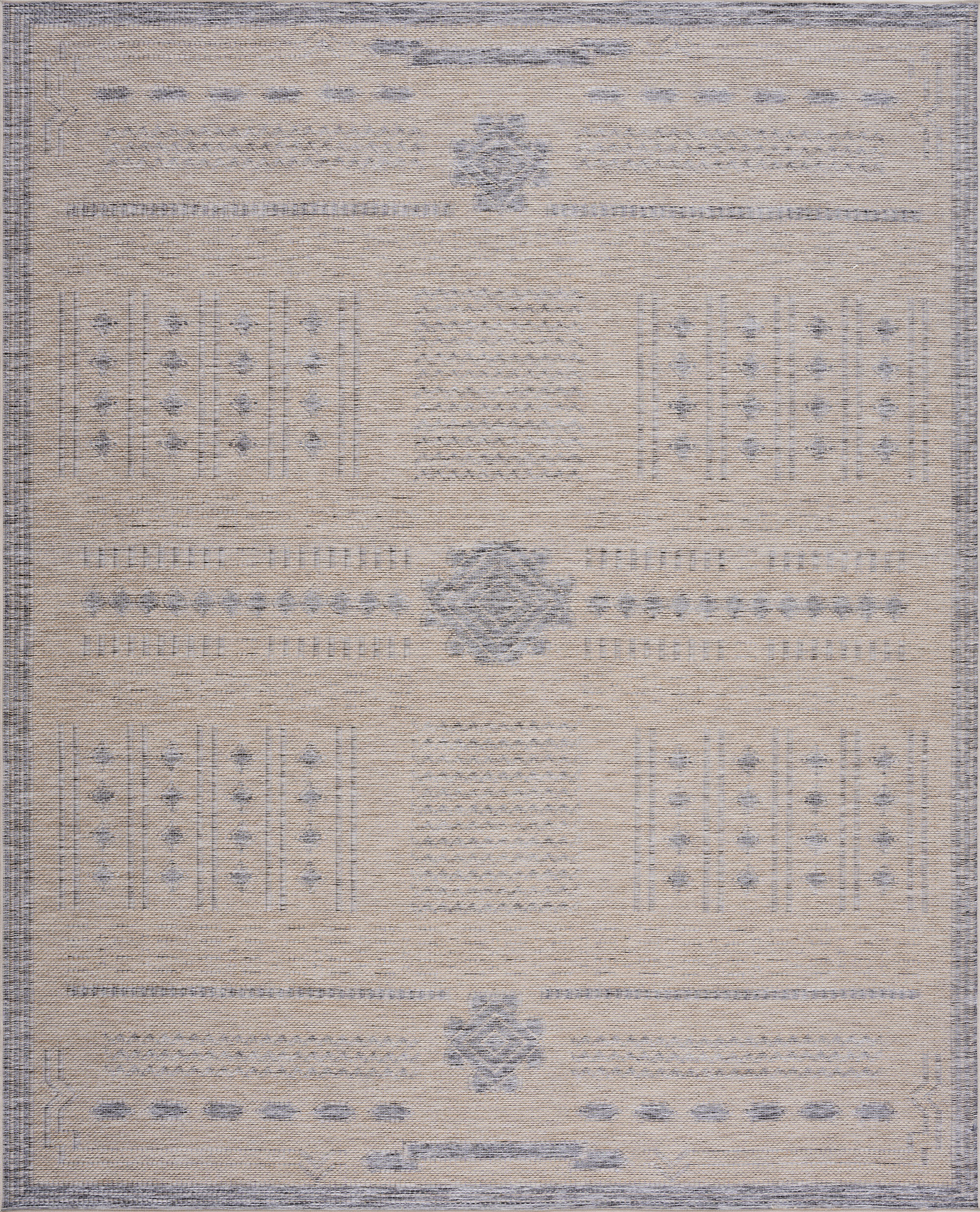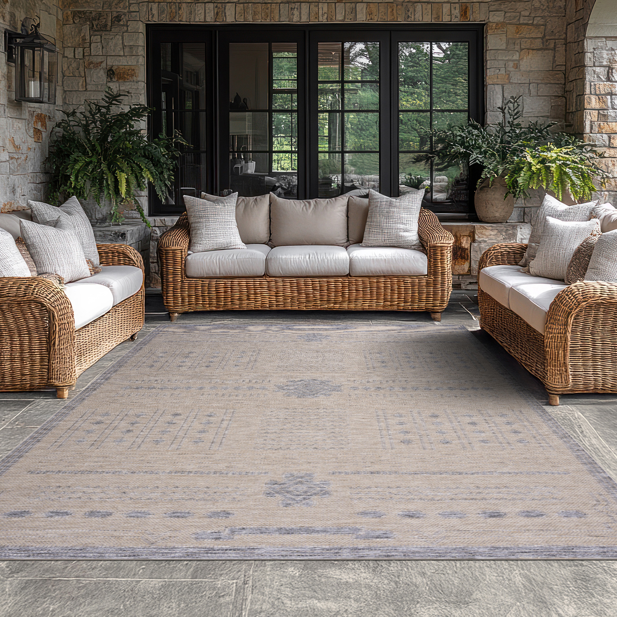 The design of this rug features a captivating avant-garde pattern, showcasing a unique blend of geometric shapes and abstract forms. The neutral tones dominate the palette, creating a sophisticated and versatile look that seamlessly integrates with various outdoor settings. These neutral hues contribute to a sense of modern sophistication while allowing the unique pattern to take center stage. The flatwoven texture adds depth and dimension to the rug, creating a visually stimulating yet harmonious effect. Sweep or vacuum without beater bar to remove debris. Clean outside with water from garden hose. Perfect for a balcony, courtyard, veranda, deck, mudroom, patio, porch, portico, or gazebo.