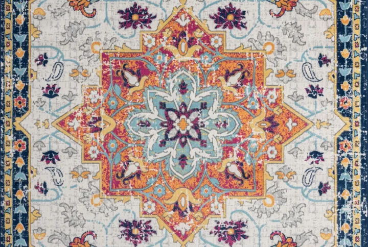 Persian style reworked in amazing color to create a unique transitional medallion indoor area rug. Bohemian, Farmhouse, Shabby Chic, and Eclectic decor will get a style boost. Vacuum on high pile setting to remove debris taking care to avoid fraying the edges. Rotate periodically to extend the life of your investment.