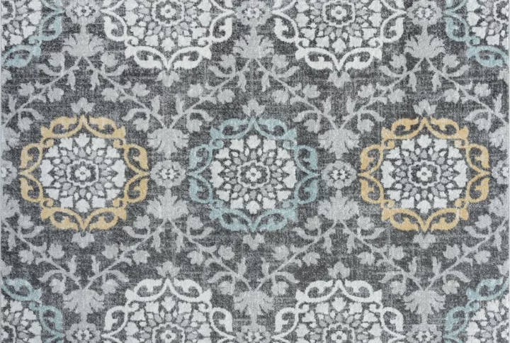 Filigree medallions adorned with floral motifs give this transitional indoor area rug charming appeal. Neutral colors keep it on-trend. Perfect for living room, dining room or bedroom. Vacuum on high pile setting to remove debris taking care to avoid fraying the edges. Rotate periodically to extend the life of your investment.