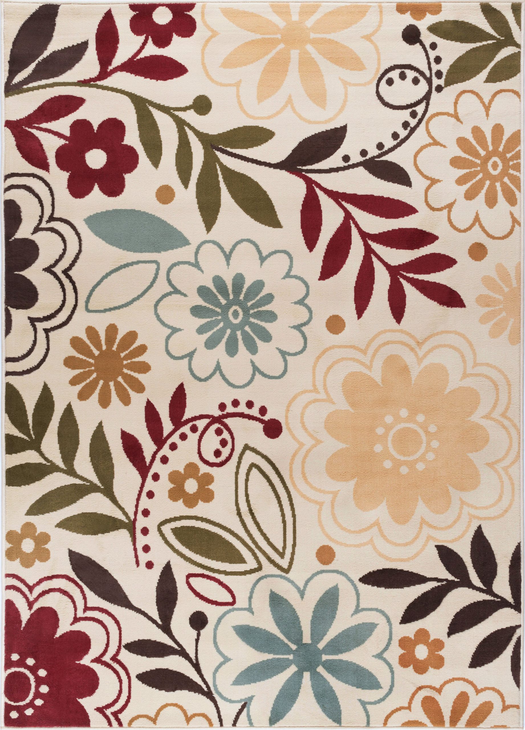 Add a natural element to your style with this area rug. This rug features an upbeat floral pattern in rich hues of red, brown, blue and green placed on an inviting beige field. It offers a cheery addition to your home, and will fit in with any setting. The 100% polypropylene construction lends durability and versatility to this piece. This design is available in several individual sizes and as a three piece set so you can unify your look throughout your home.