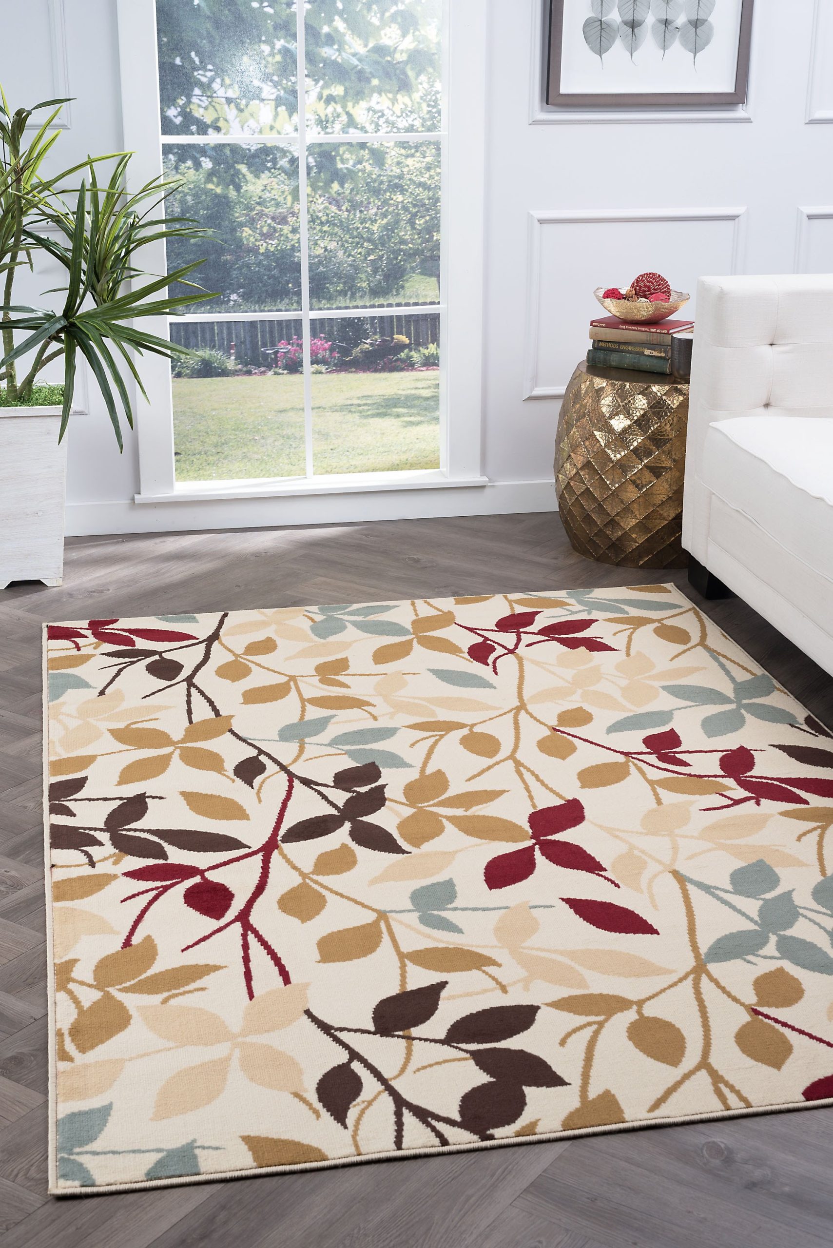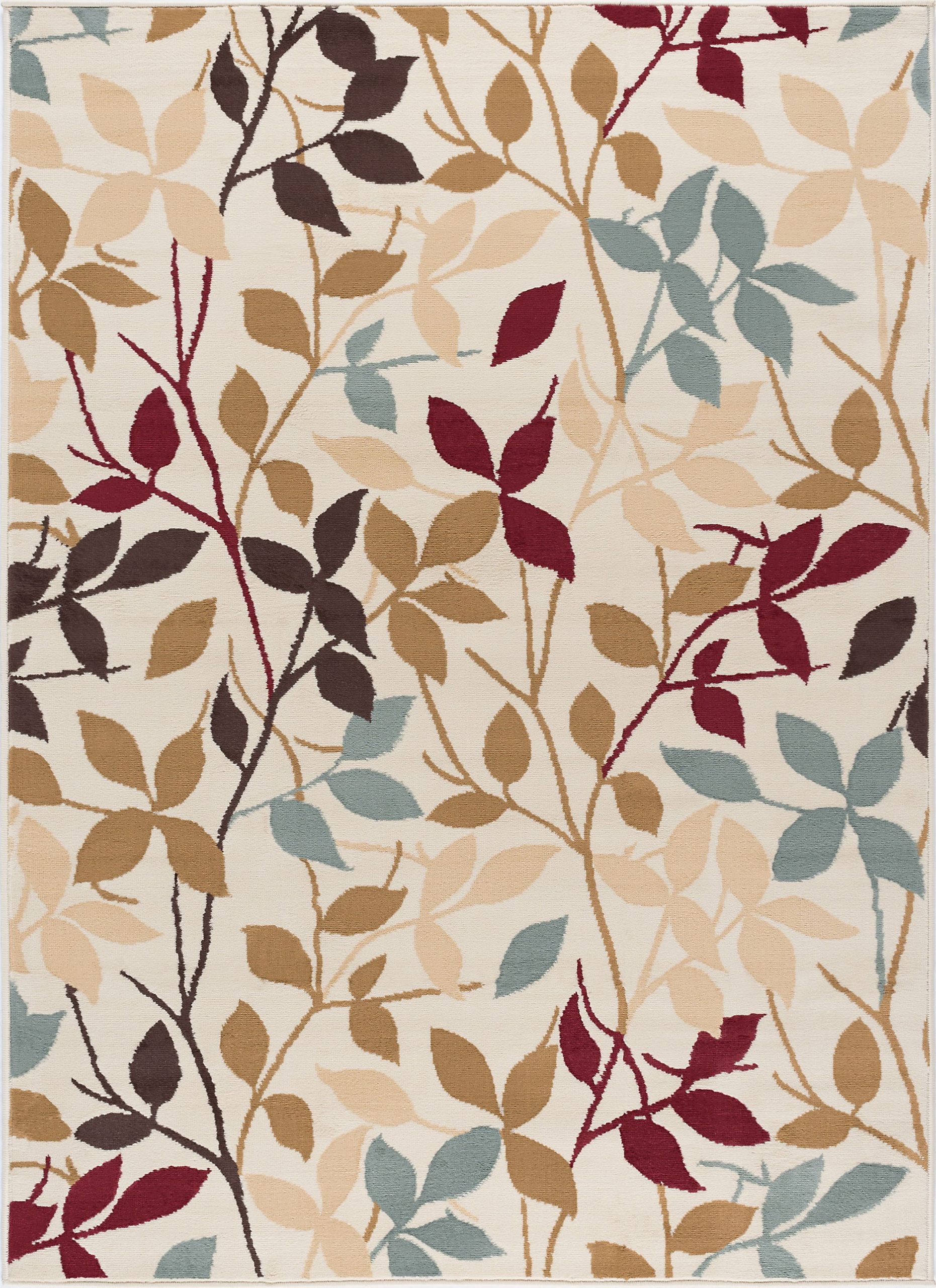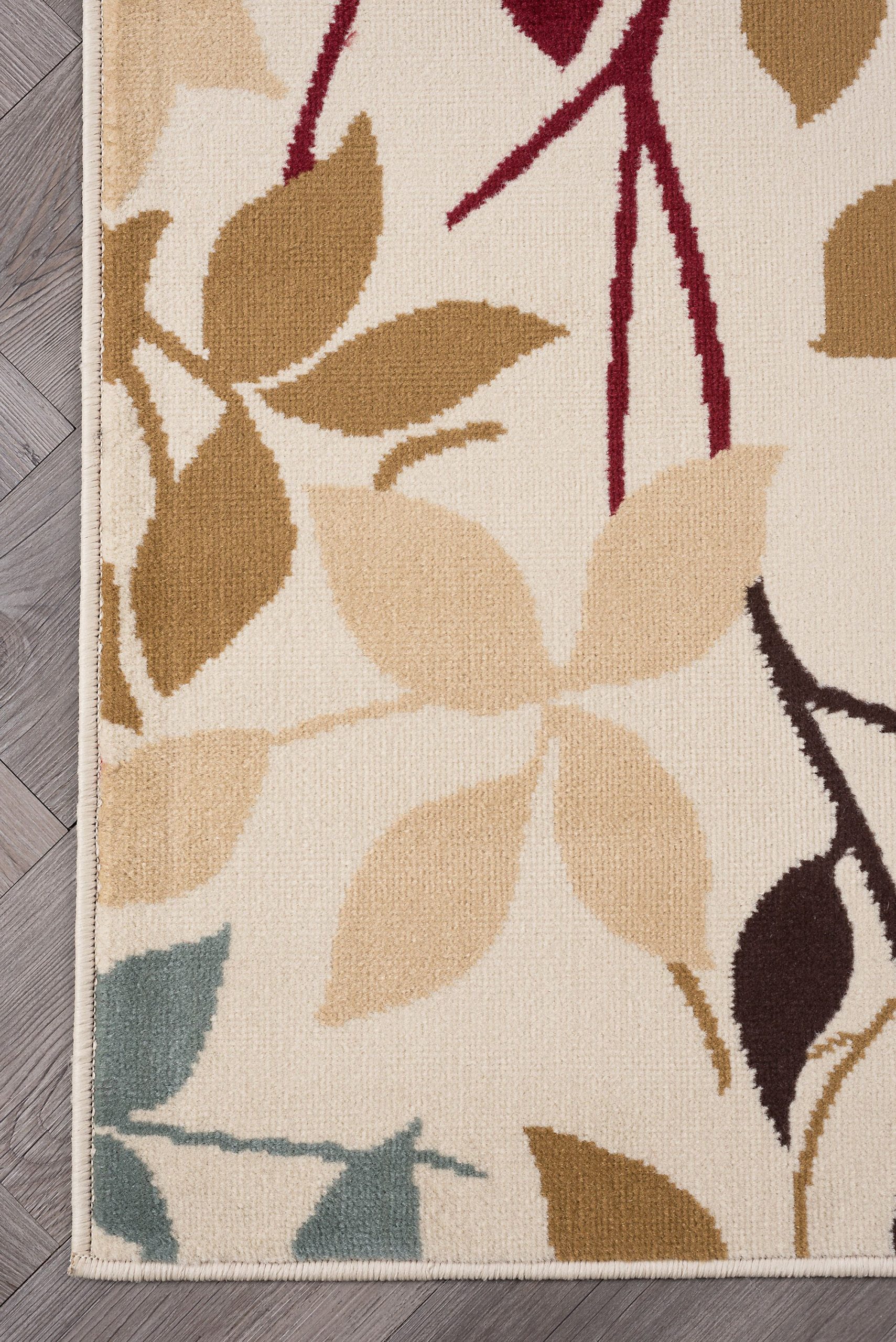 Composed of leaves and vines in various silhouetted colors. Add a natural spark of color to your room with this lively design and create a warm ambience that is perfect for entertaining. The transitional design is complemented by durable 100% polypropylene construction for confident placement in any setting. It is sure to provide comfort and delight for years to come. Ivory background with blue, green, red, bronze, gold and brown. This rug is available in several individual sizes and as a three piece set so you can harmonize your theme throughout your home. It is easy to care for, vacuum regularly to maintain its appearance. Spot clean as needed with mild detergent, do not dry clean or bleach.