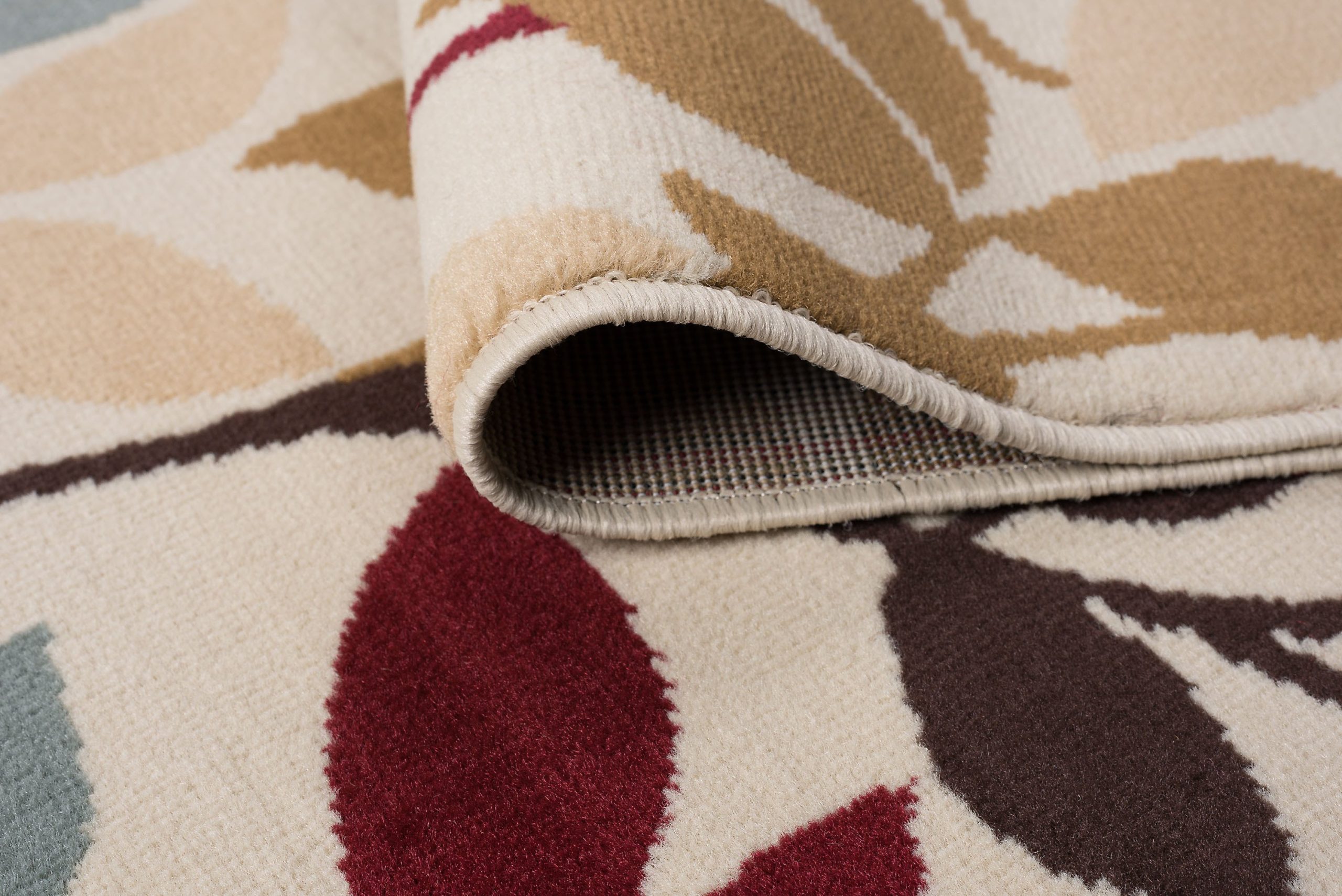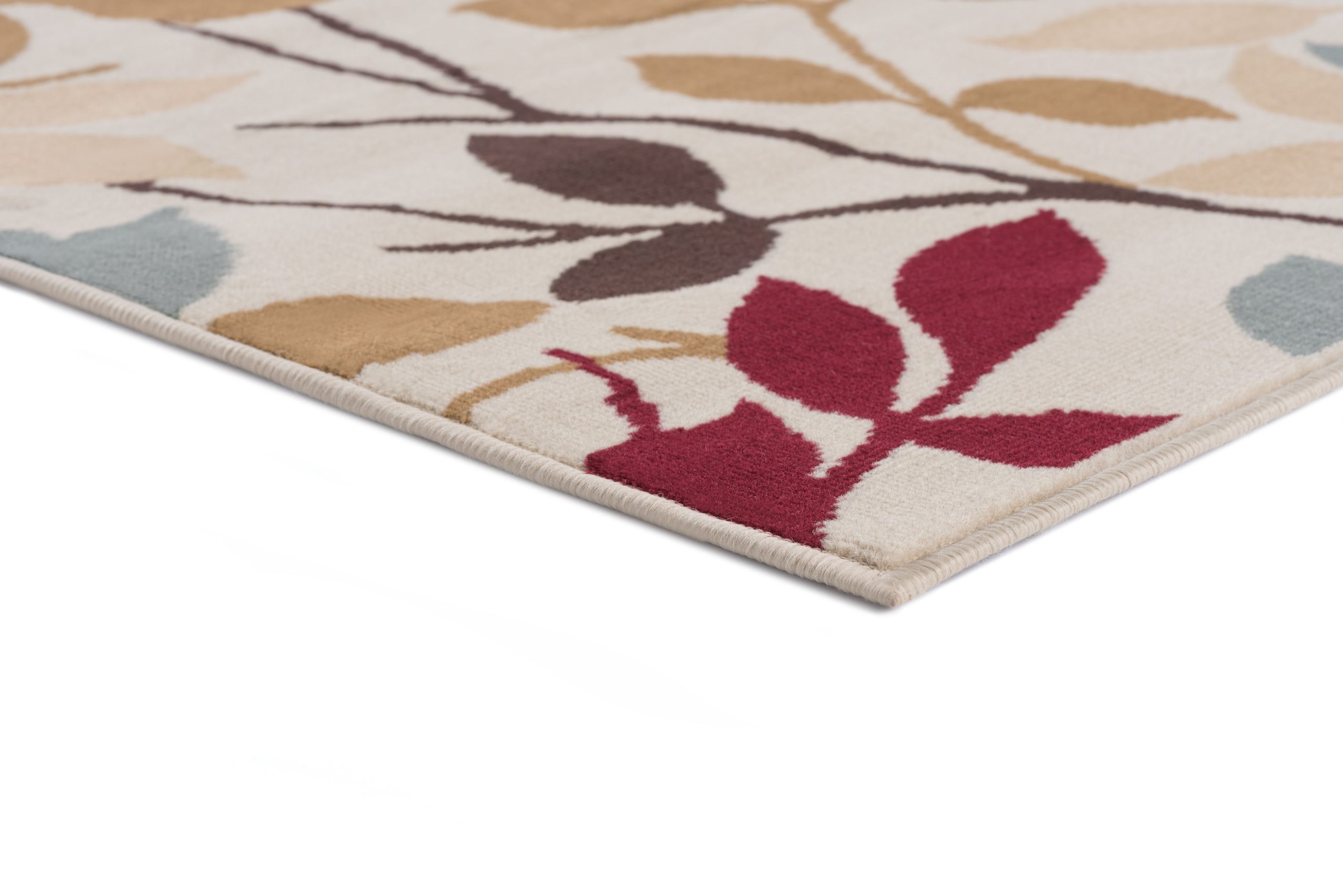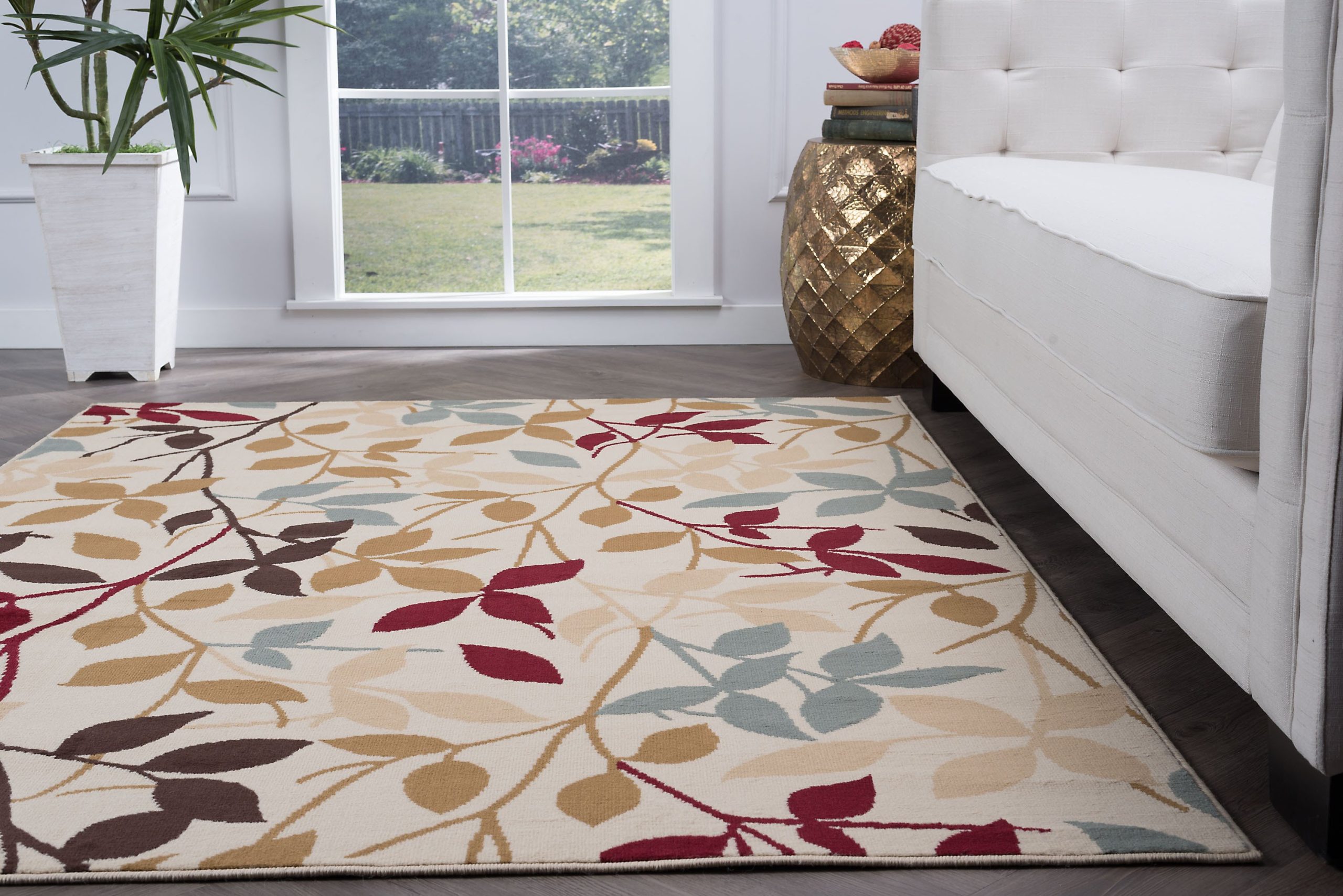 Composed of leaves and vines in various silhouetted colors. Add a natural spark of color to your room with this lively design and create a warm ambience that is perfect for entertaining. The transitional design is complemented by durable 100% polypropylene construction for confident placement in any setting. It is sure to provide comfort and delight for years to come. Ivory background with blue, green, red, bronze, gold and brown. This rug is available in several individual sizes and as a three piece set so you can harmonize your theme throughout your home. It is easy to care for, vacuum regularly to maintain its appearance. Spot clean as needed with mild detergent, do not dry clean or bleach.