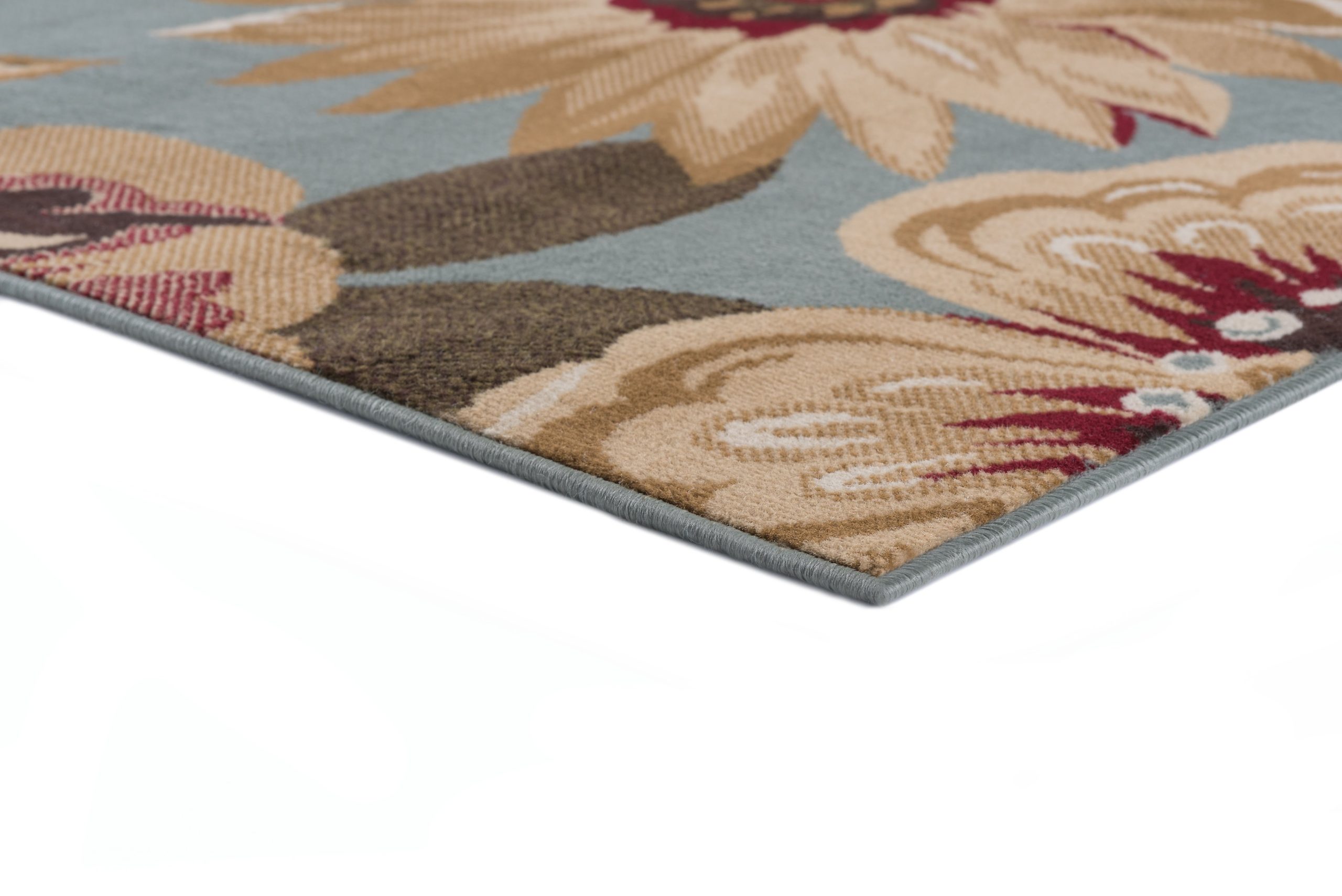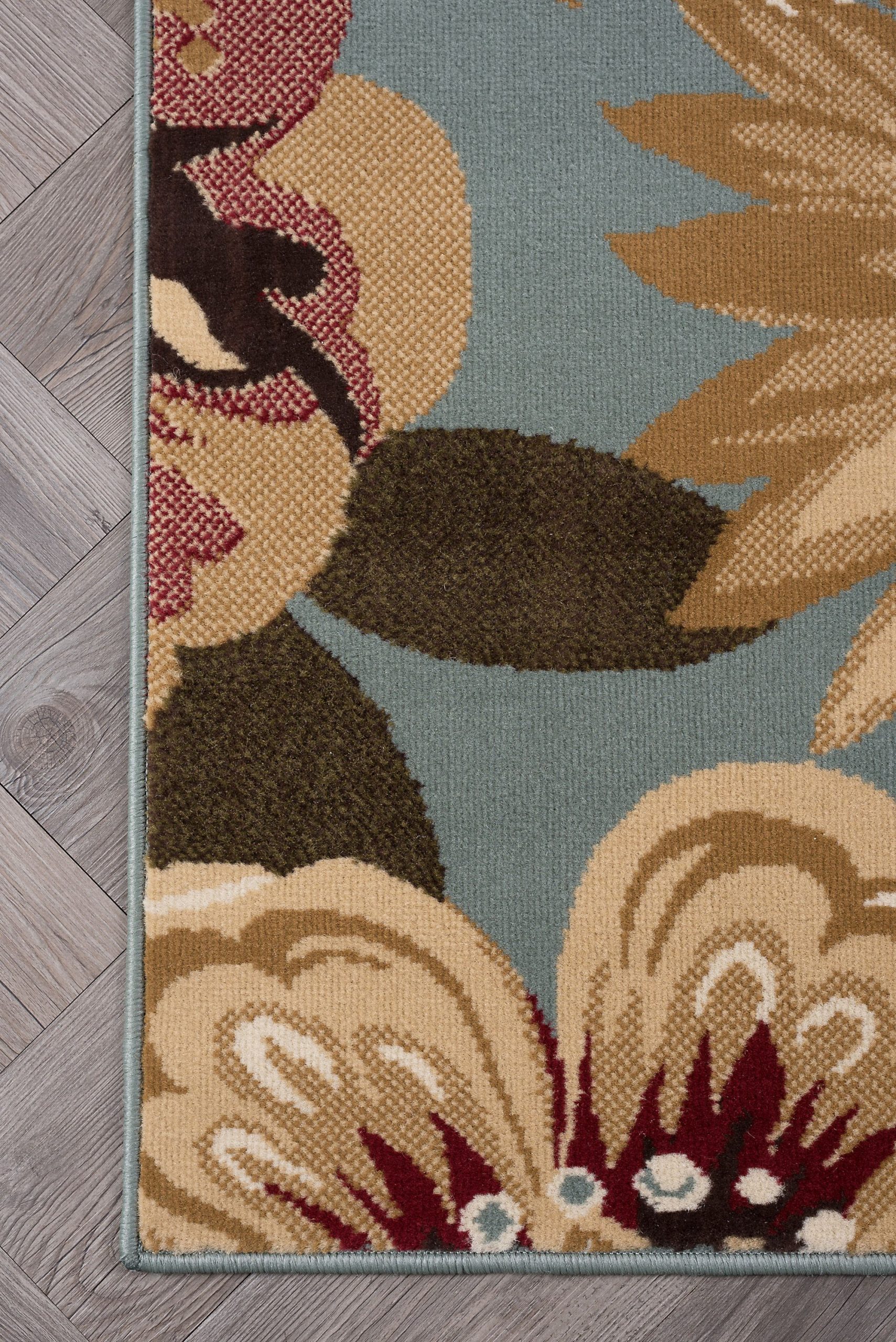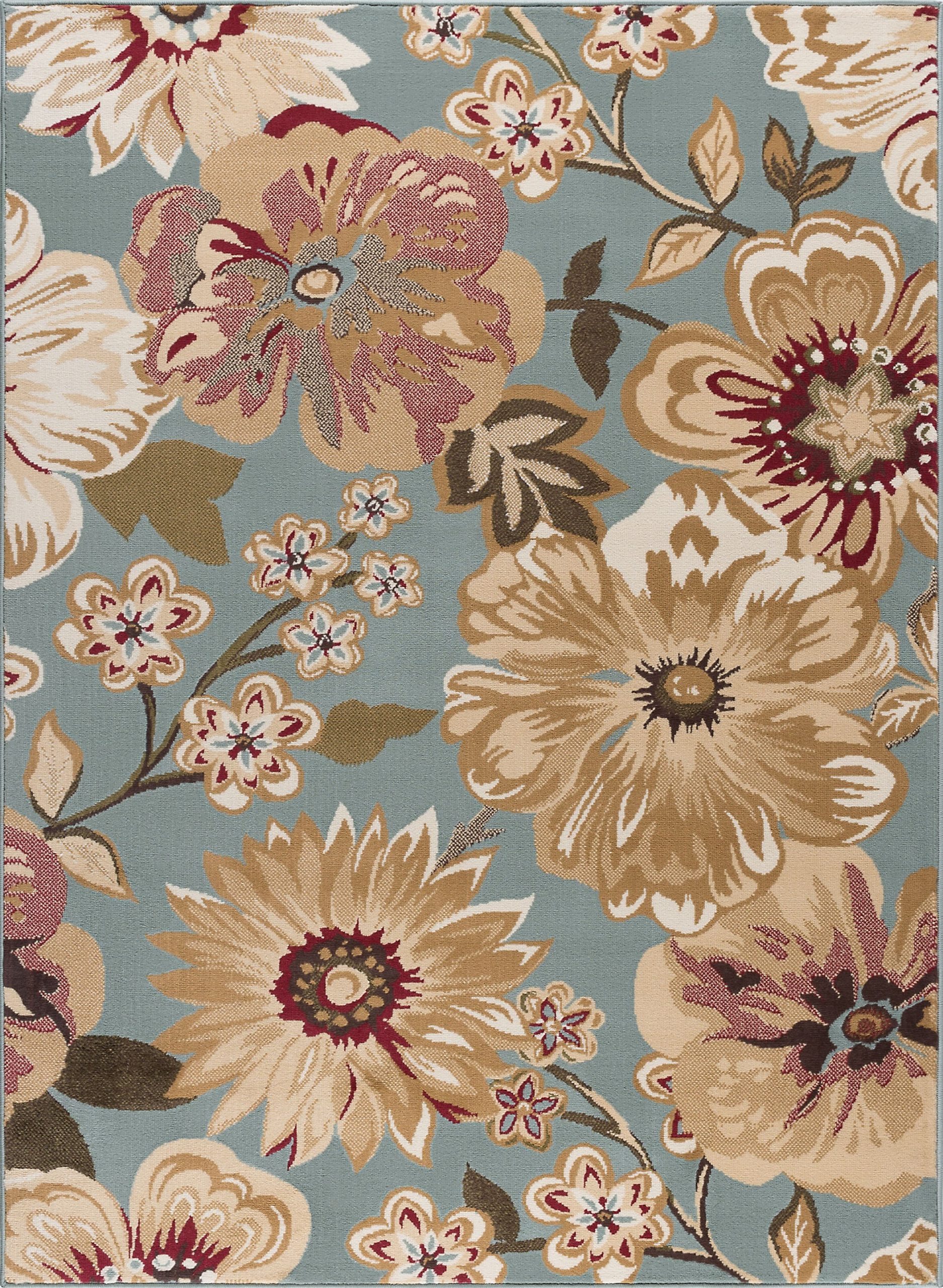 A floral fantasy comprised of various blossoms in harmony. This transitional area rug has just the right touch of femininity to warm any decor. Blue background with gold, ivory, beige, red and green. This rug is available in several individual sizes and as a three piece set so you can harmonize your theme throughout your home. It is easy to care for, vacuum regularly to maintain its appearance. Spot clean as needed with mild detergent, do not dry clean or bleach.