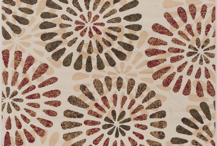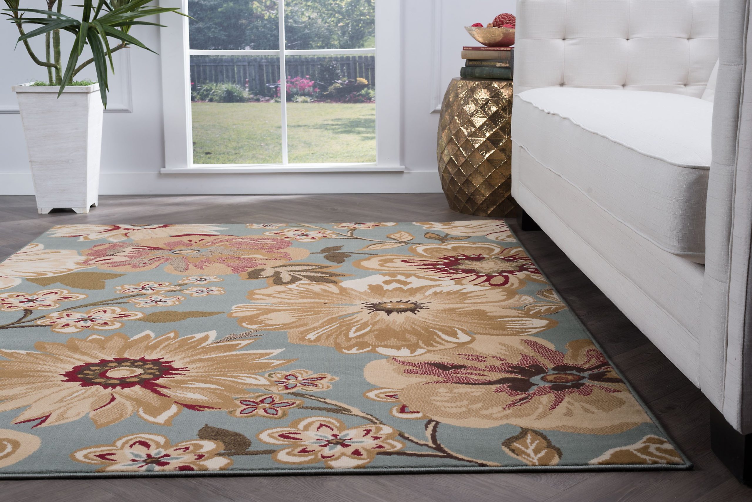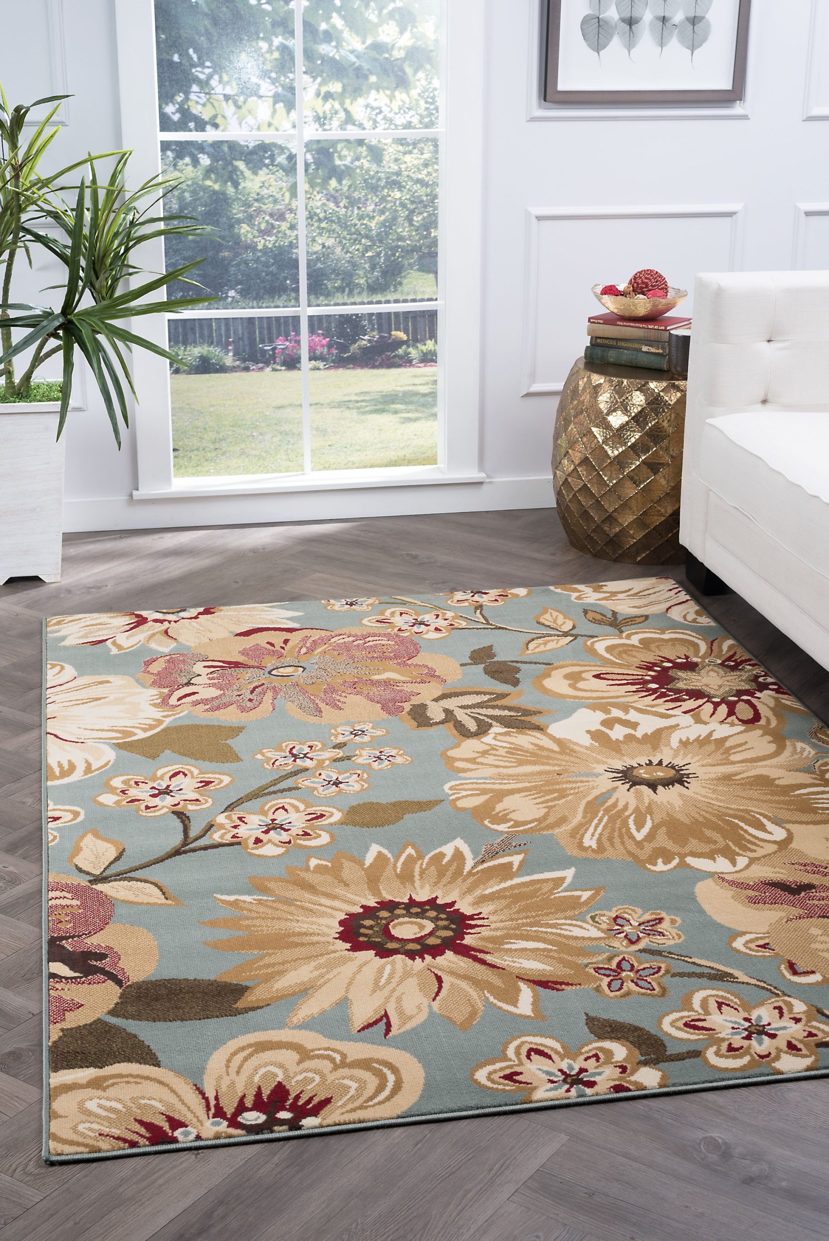A floral fantasy comprised of various blossoms in harmony. This transitional area rug has just the right touch of femininity to warm any decor. Blue background with gold, ivory, beige, red and green. This rug is available in several individual sizes and as a three piece set so you can harmonize your theme throughout your home. It is easy to care for, vacuum regularly to maintain its appearance. Spot clean as needed with mild detergent, do not dry clean or bleach.