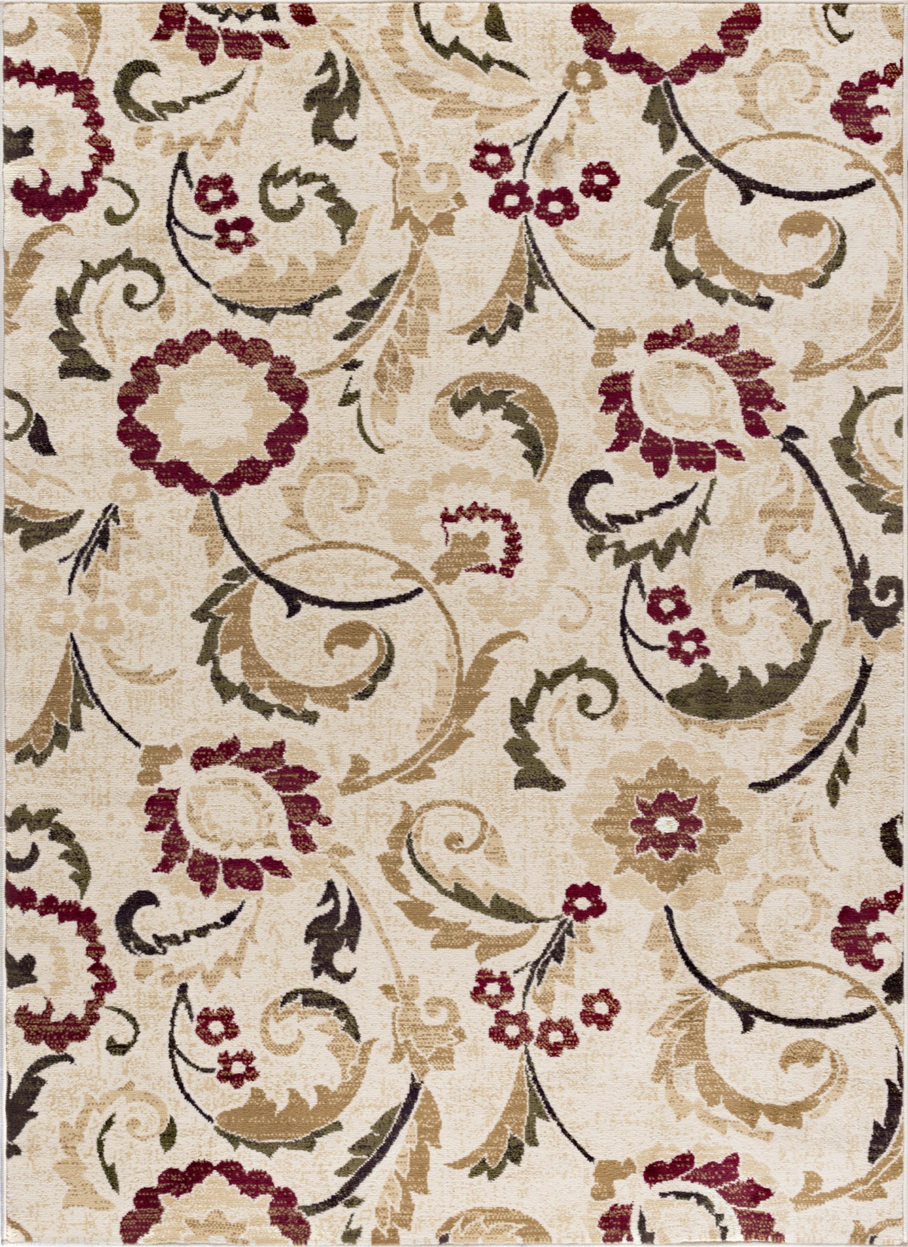 This traditional brocade design has been updated with a contemporary rhythm. The favorable blend of hues creates a transitional area rug that will transcend rigid design constraints. Ivory background with gold, beige, brown, green, blue and red. Available in several individual sizes and as a three piece set so you can harmonize your theme throughout your home. It is easy to care for, vacuum regularly to maintain its appearance. Spot clean as needed with mild detergent, do not dry clean or bleach.