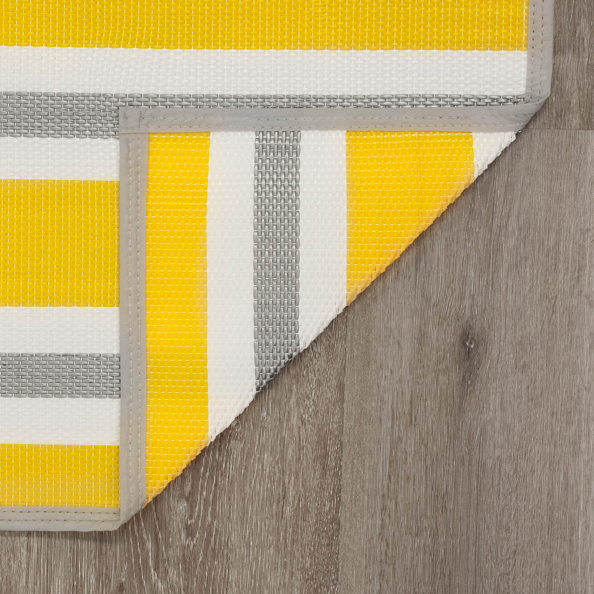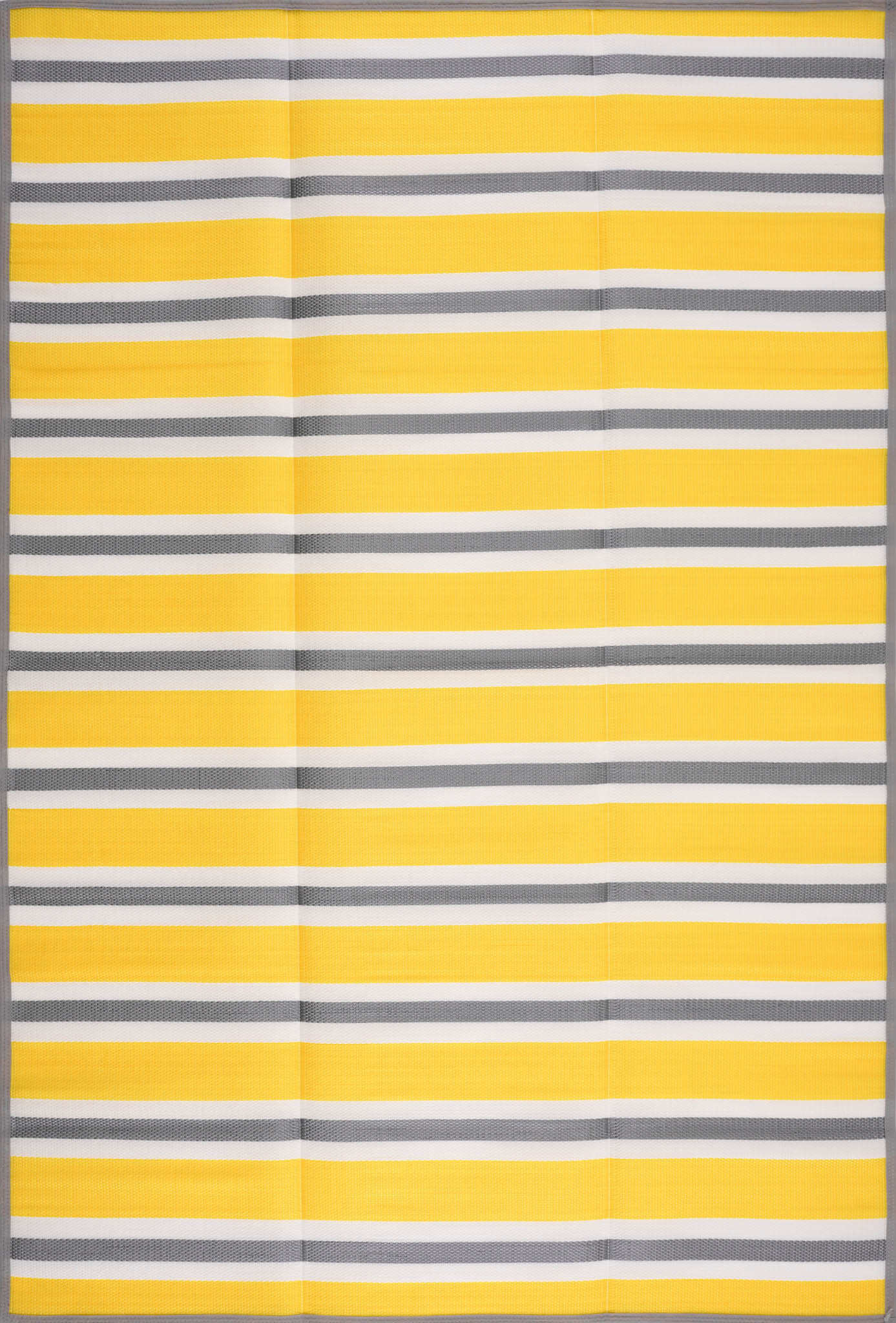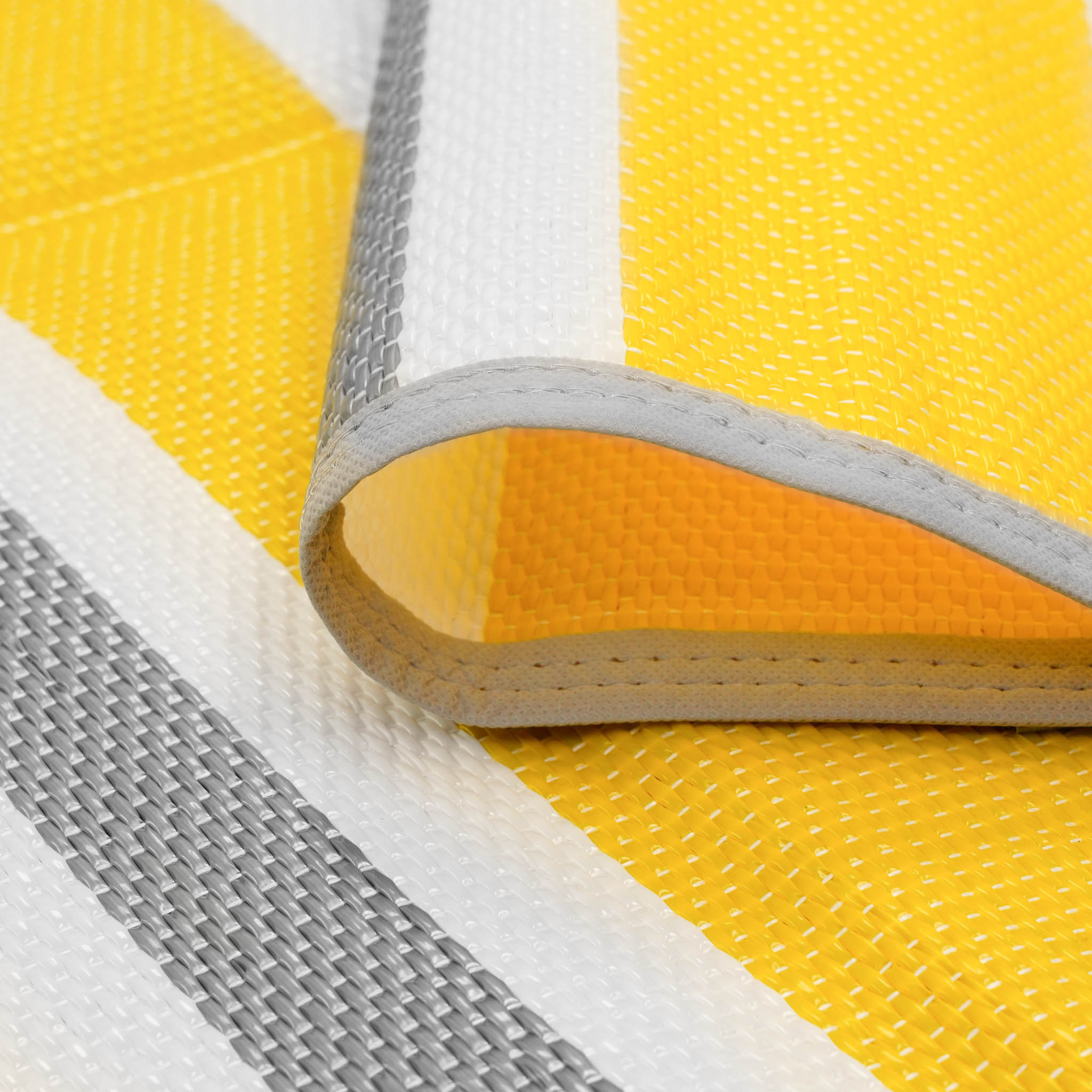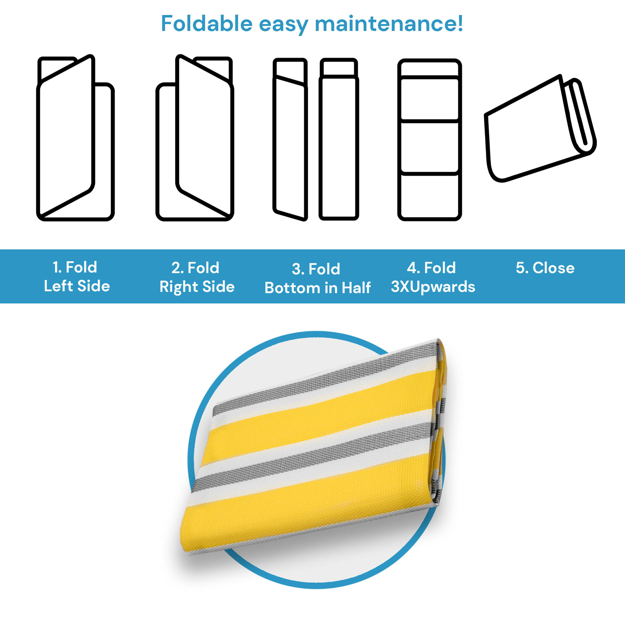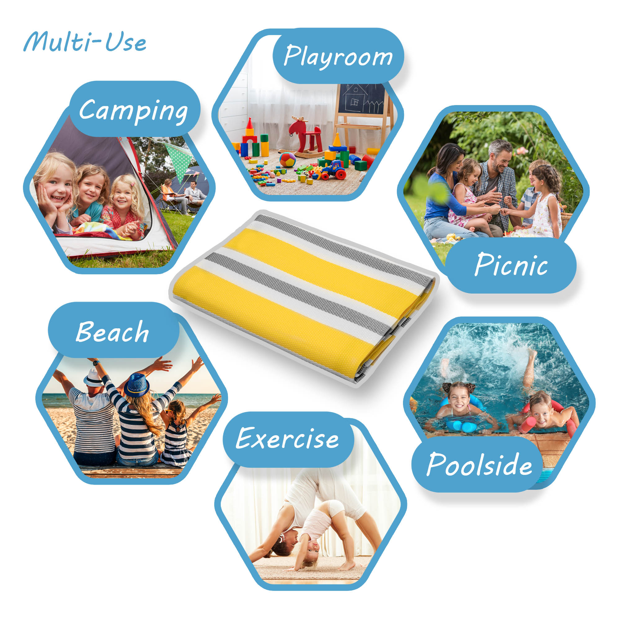 This multi-use foldable, waterproof outdoor rug is perfect for any adventure. Use this portable, reversible area rug mat for playroom, exercise, poolside, camping, or picnic. In a colorful multiple stripe pattern. Natural stain-resistance and no additional treatments make it kid and pet friendly. Vacuum or shake to remove debris. Spot clean or clean outside with water; spray with garden hose to rinse. Allow to dry thoroughly.