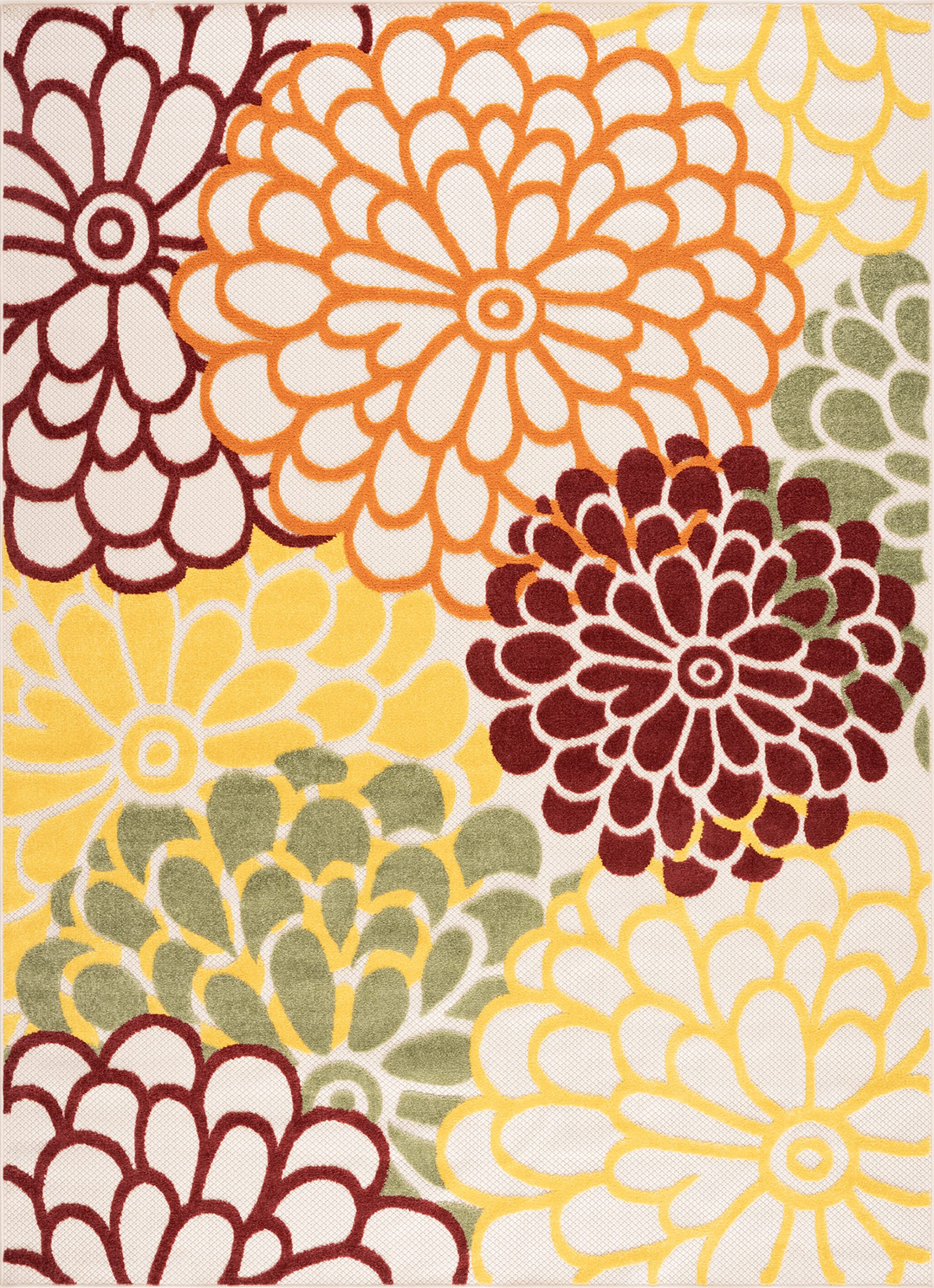 The high-low pile combined with easy-care endurance of this colorful waterproof area rug create a relaxing space for your indoor or outdoor room. May be cleaned outside with a garden hose, allow to dry thoroughly. Rotate periodically to prevent fading and wear. Chrysanthemum blooms fill the space with an exciting floral pattern in trending colors.