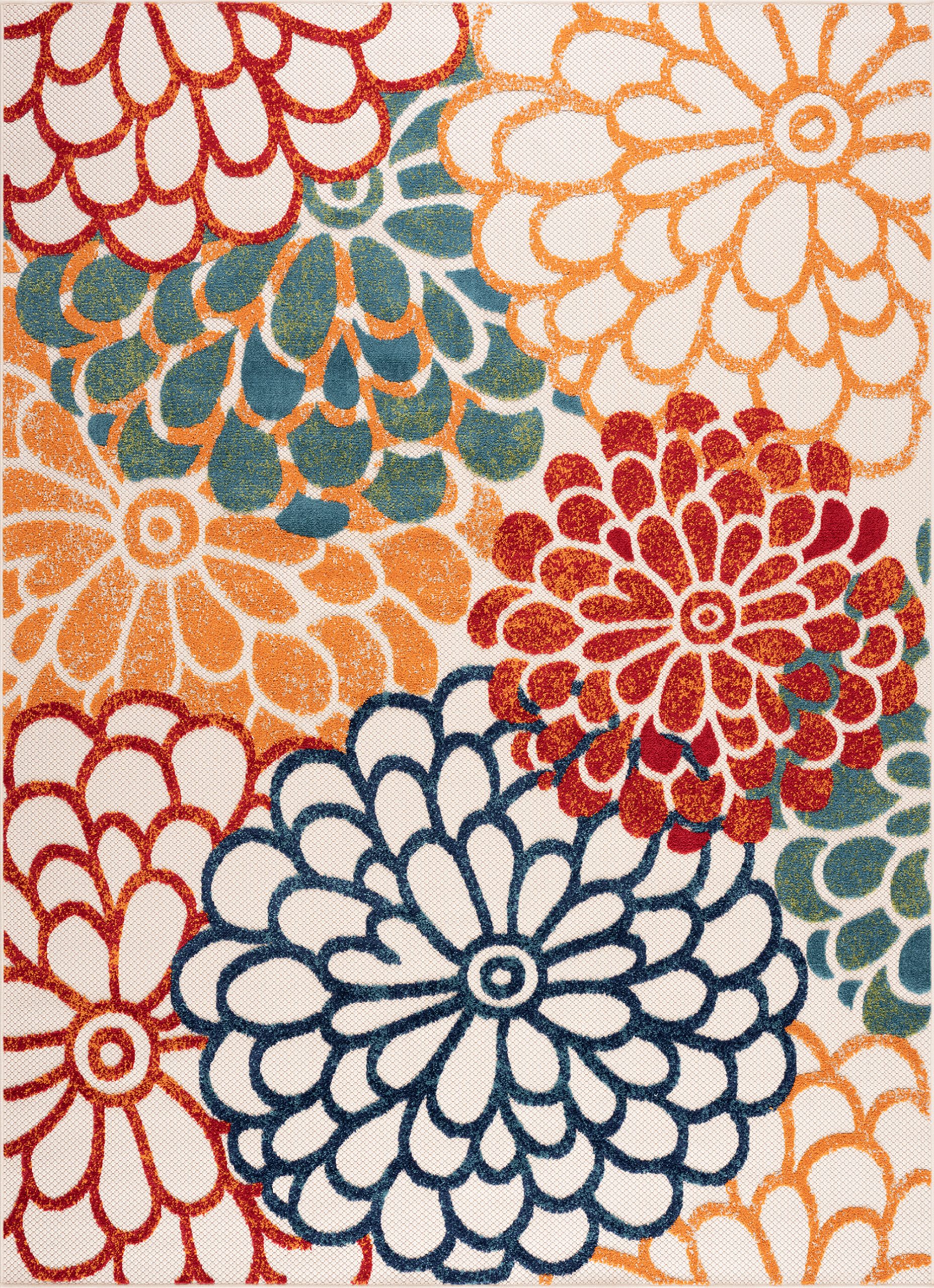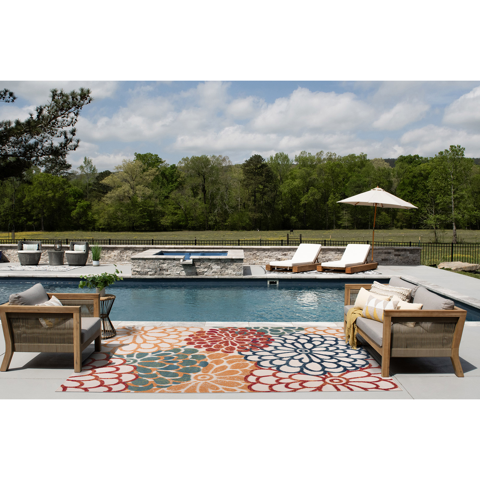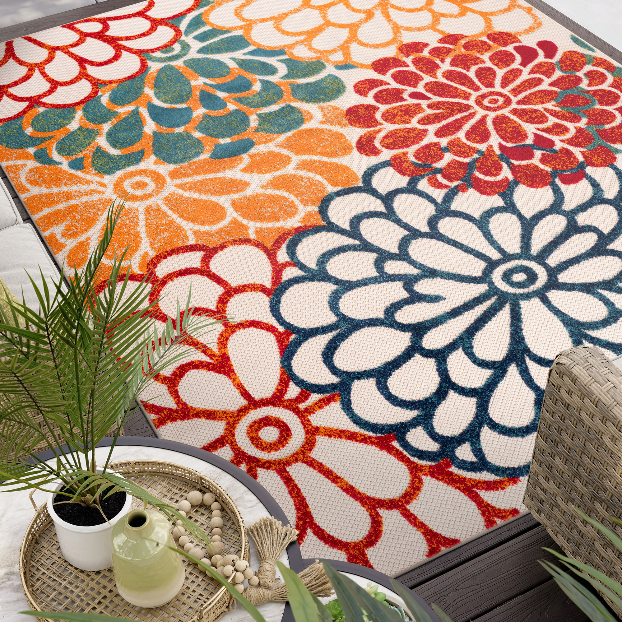 The high-low pile combined with easy-care endurance of this colorful waterproof area rug create a relaxing space for your indoor or outdoor room. May be cleaned outside with a garden hose, allow to dry thoroughly. Rotate periodically to prevent fading and wear. Chrysanthemum blooms fill the space with an exciting floral pattern in trending colors.