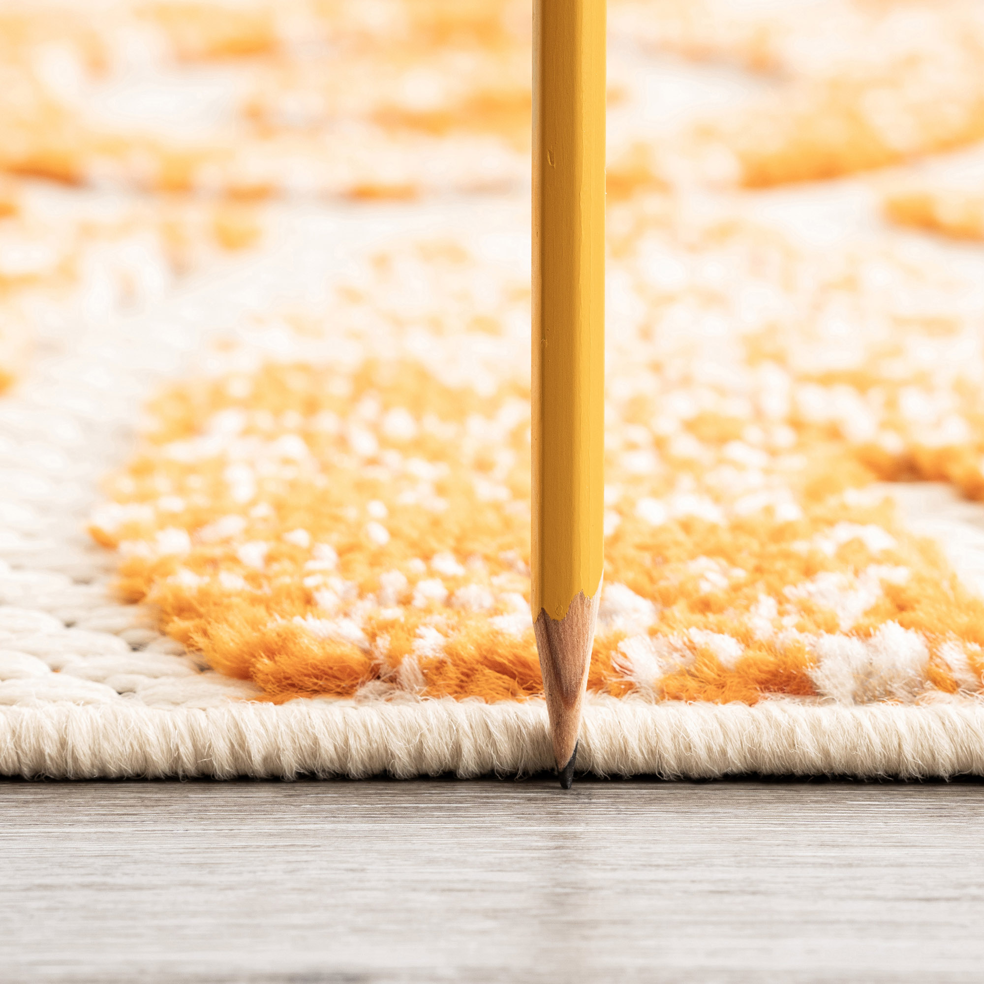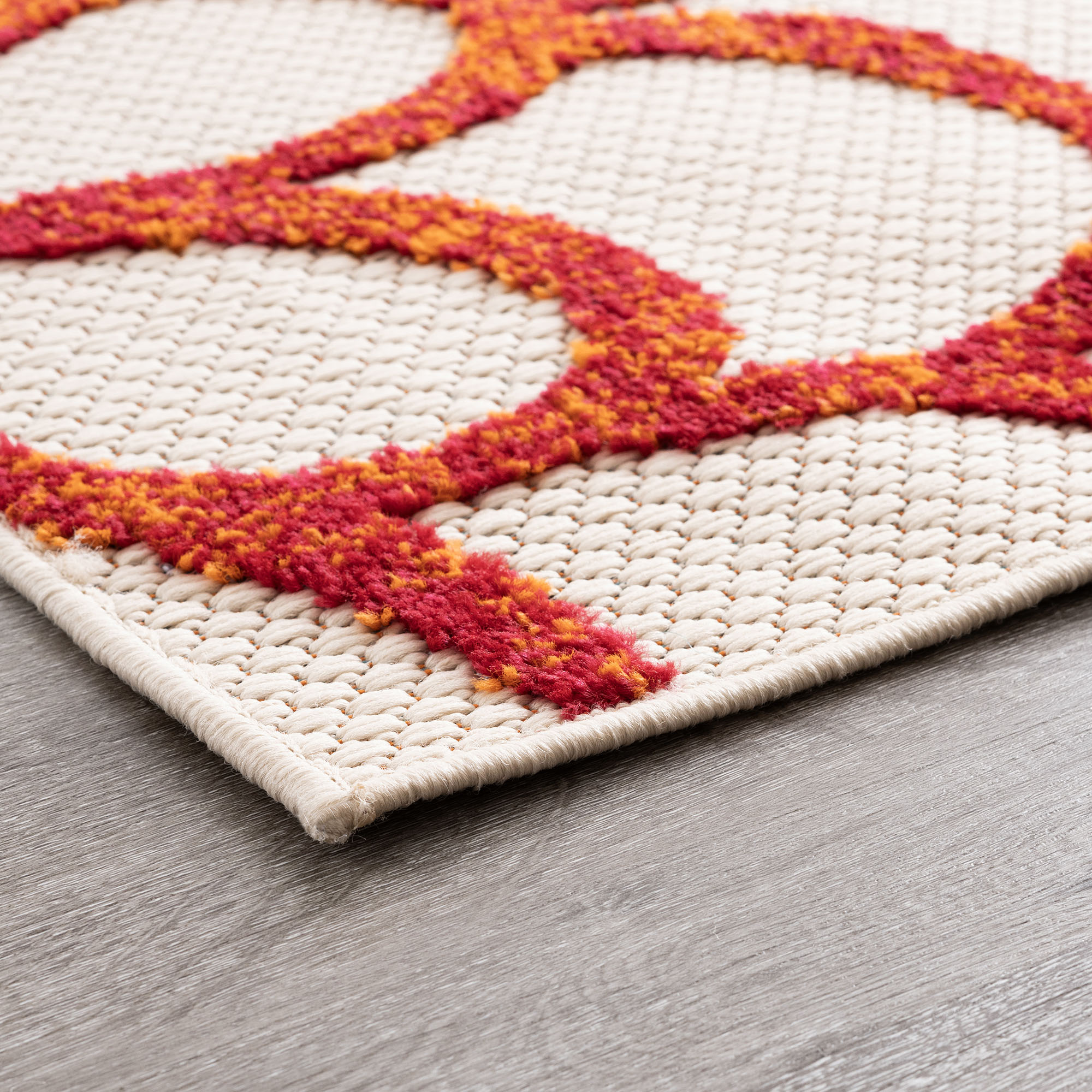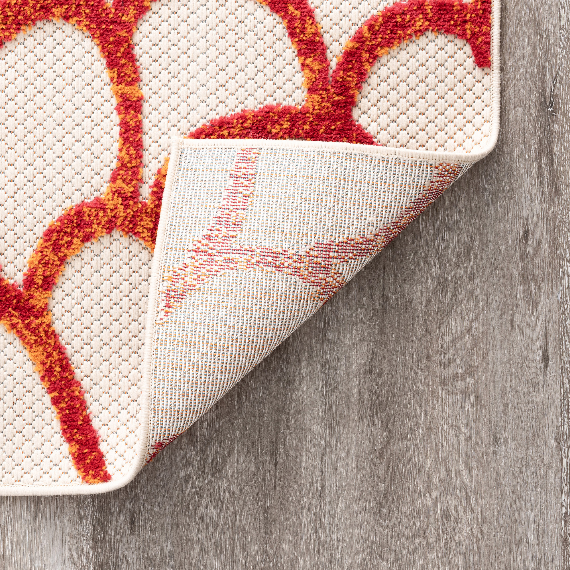 The high-low pile combined with easy-care endurance of this colorful waterproof area rug create a relaxing space for your indoor or outdoor room. May be cleaned outside with a garden hose, allow to dry thoroughly. Rotate periodically to prevent fading and wear. Chrysanthemum blooms fill the space with an exciting floral pattern in trending colors.