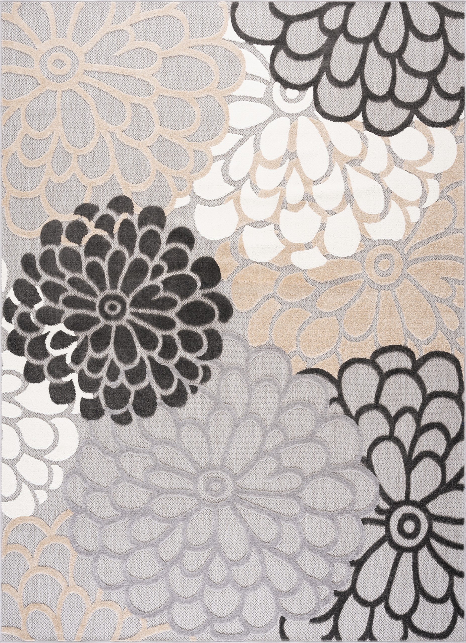The high-low pile combined with easy-care endurance of this colorful waterproof area rug create a relaxing space for your indoor or outdoor room. May be cleaned outside with a garden hose, allow to dry thoroughly. Rotate periodically to prevent fading and wear. Chrysanthemum blooms fill the space with an exciting floral pattern in trending colors.