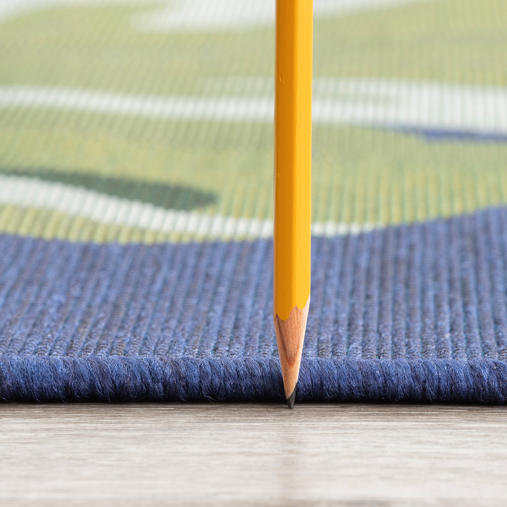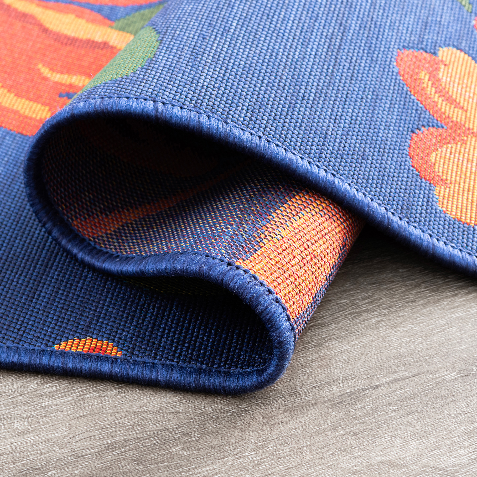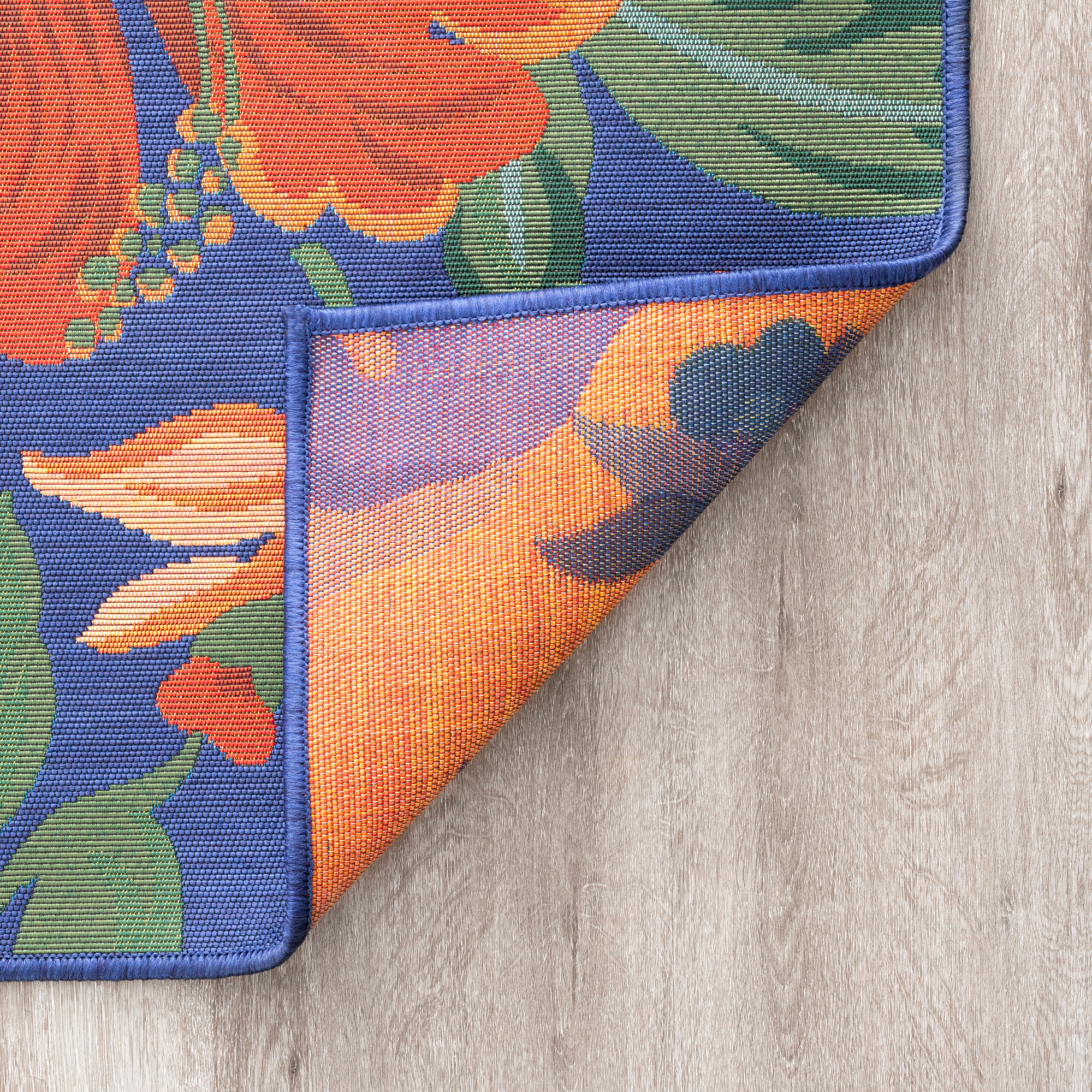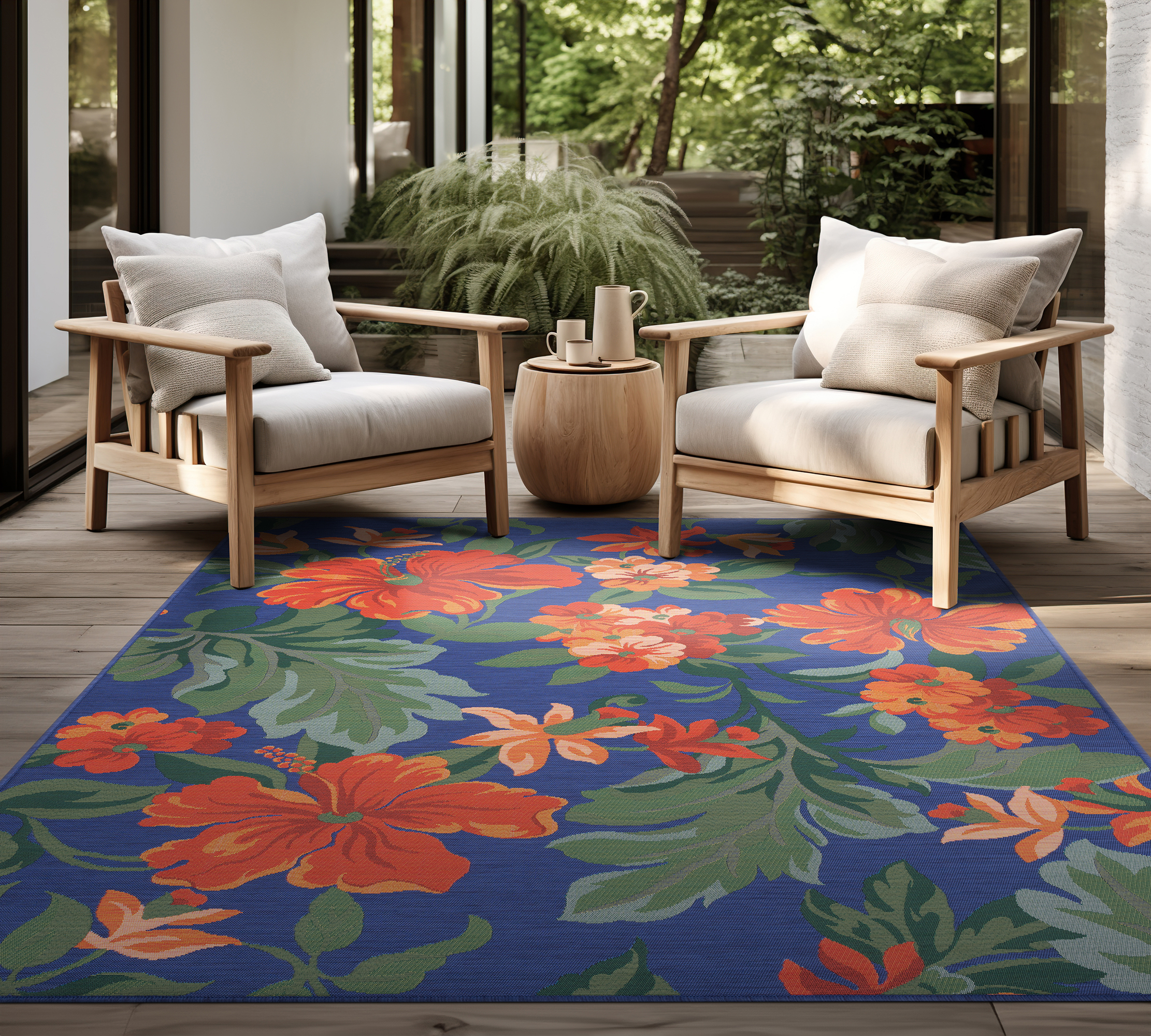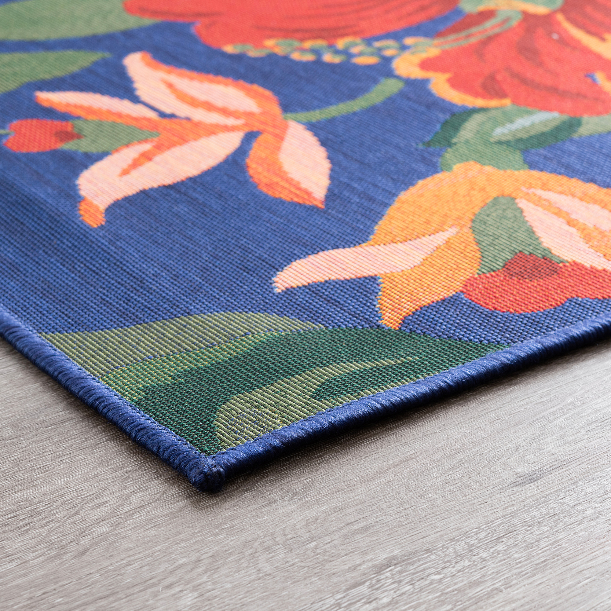 This indoor outdoor rug is crafted to resist fading from exposure to sunlight and is mold and mildew resistant. Additionally, it is easy to clean, allowing you to maintain its fresh and inviting appearance. Whether placed on a patio, deck, or any outdoor gathering space, this rug can add a refreshing and stylish element to your outdoor decor. Easy-care. Sweep or vacuum on high pile setting to remove debris. Clean with water from a garden hose and hang to dry. Cascading vines are accompanied by vibrant flowers scattered throughout the rug, adding a pop of color and visual interest. The overall aesthetic is reminiscent of a garden or floral landscape, bringing a touch of nature to your outdoor living space.