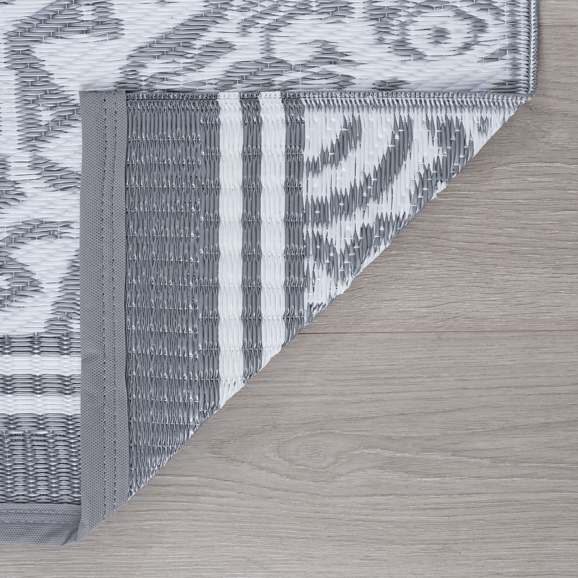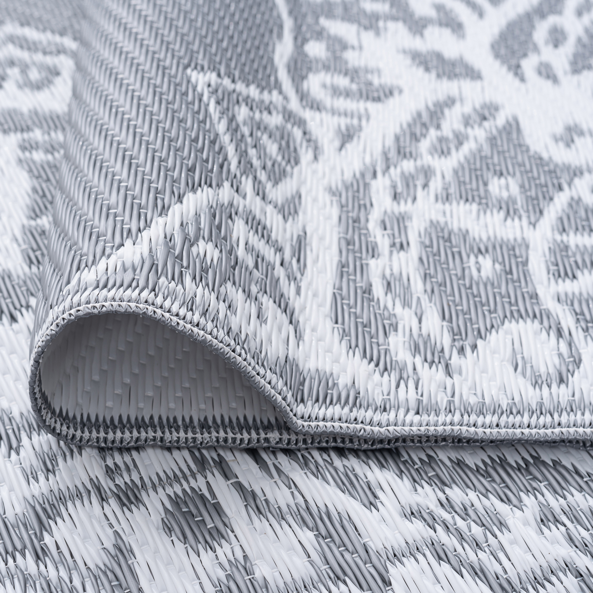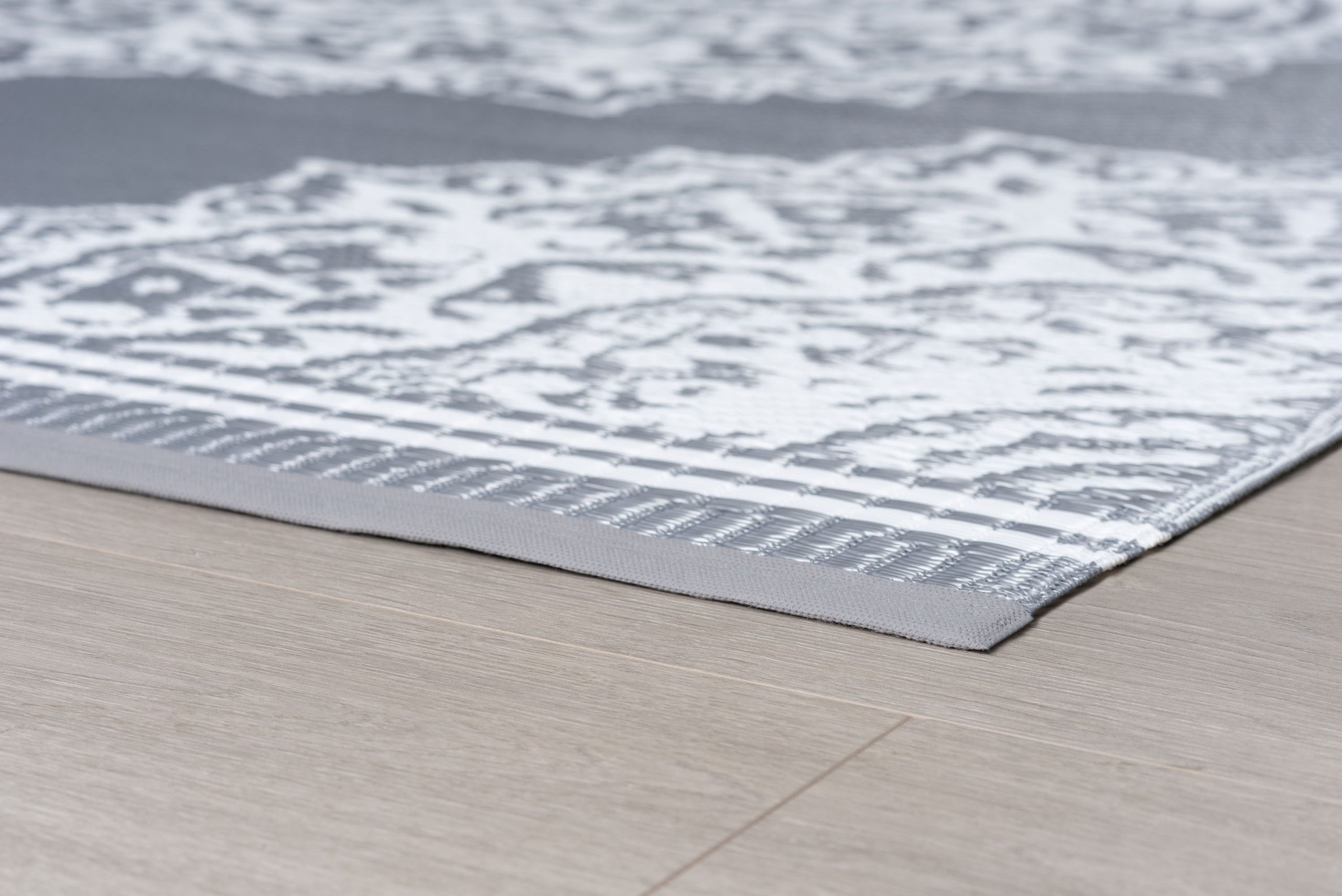 Sweet lace medallions adorn this indoor outdoor endurance area rug that is suitable for any room. Built to achieve and treated with UV resistance to stay vibrant. Perfect for a family room, sunroom, porch, deck, den, living room, playroom, nursery. May be cleaned outside with mild detergent and garden hose, allow to dry thoroughly. Spot clean with mild detergent and water when necessary.