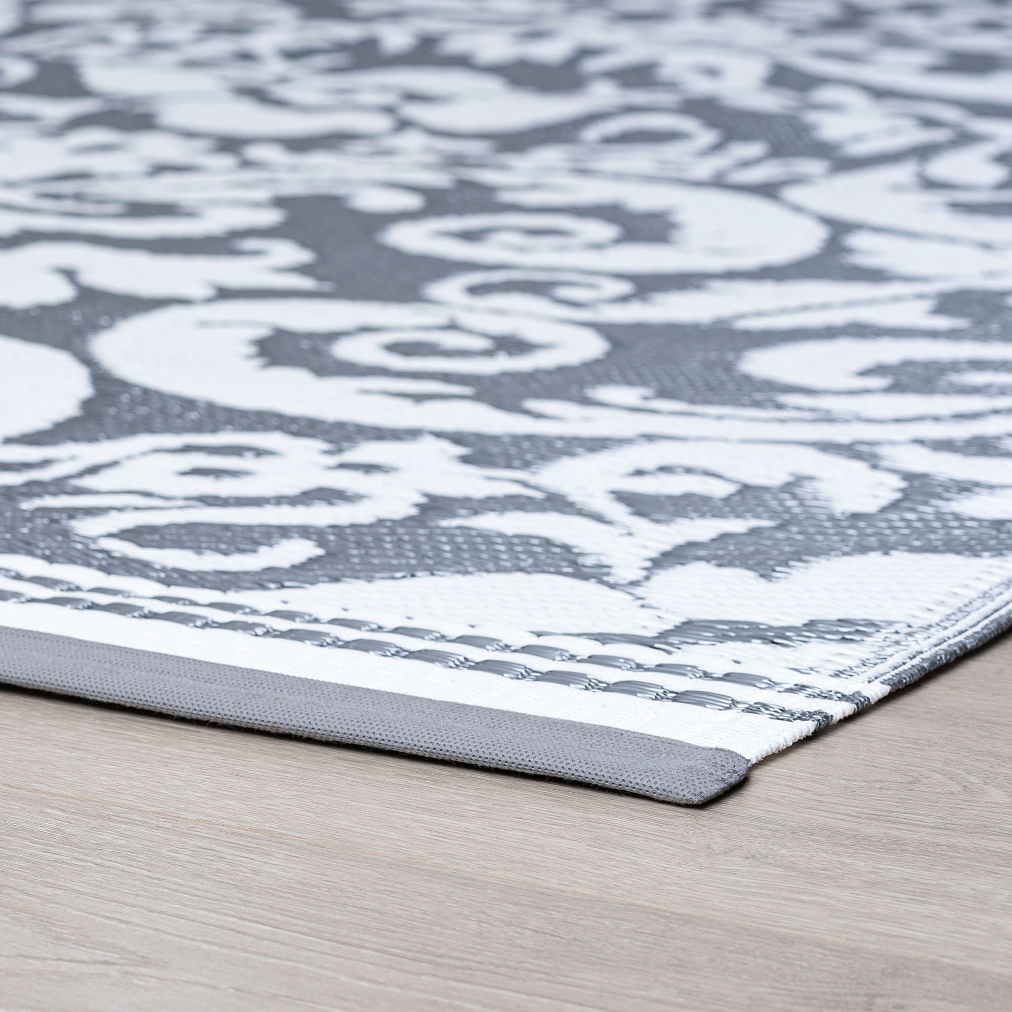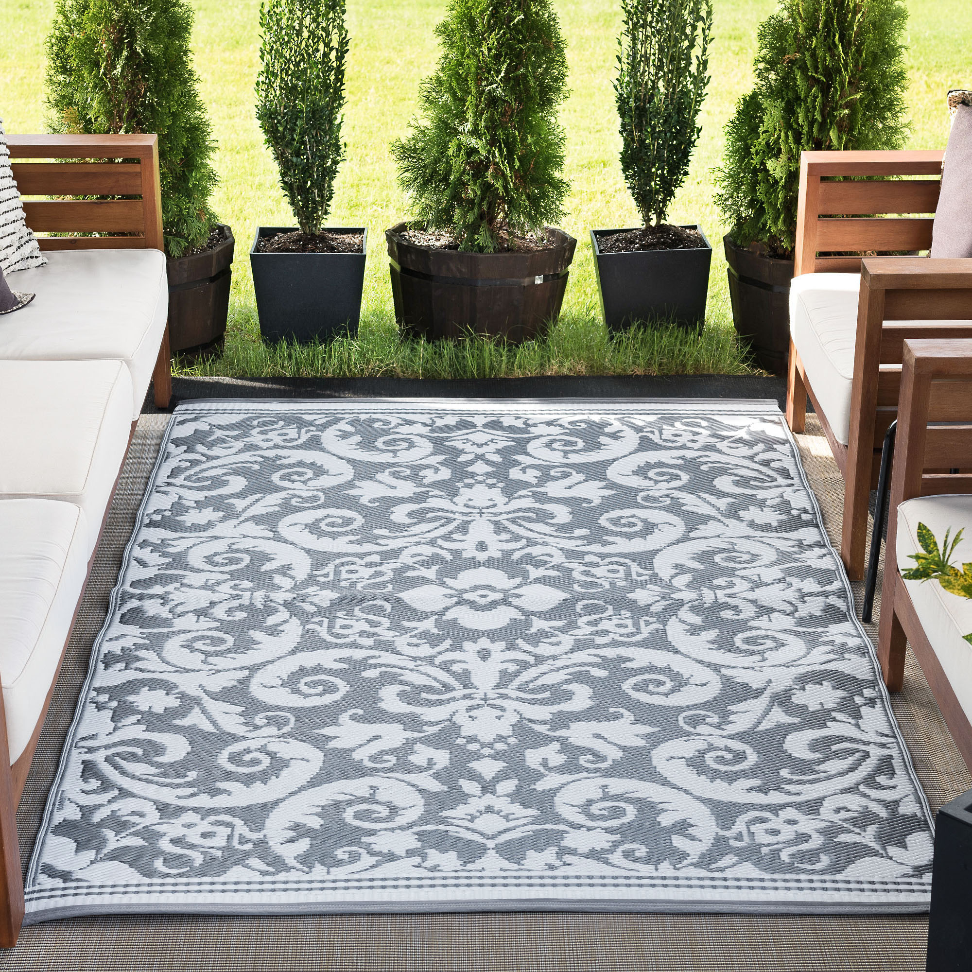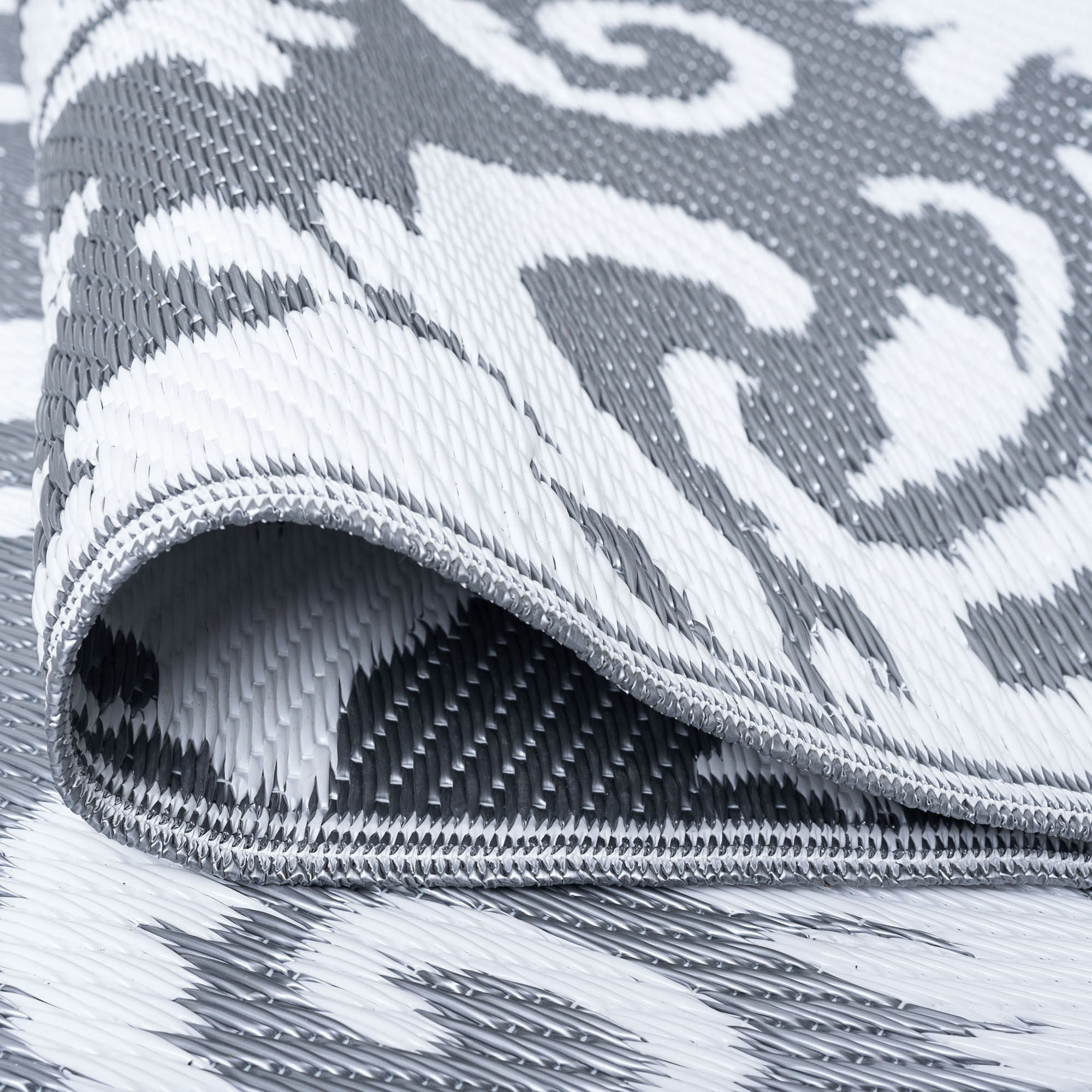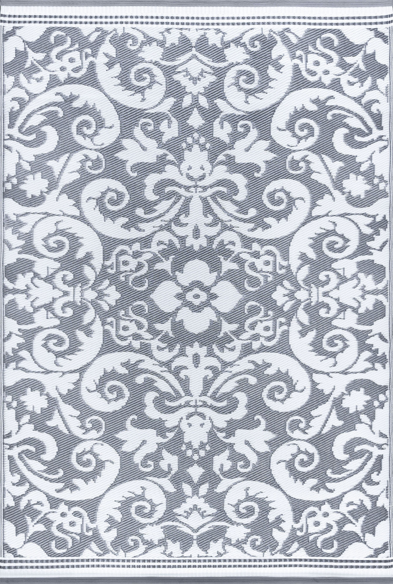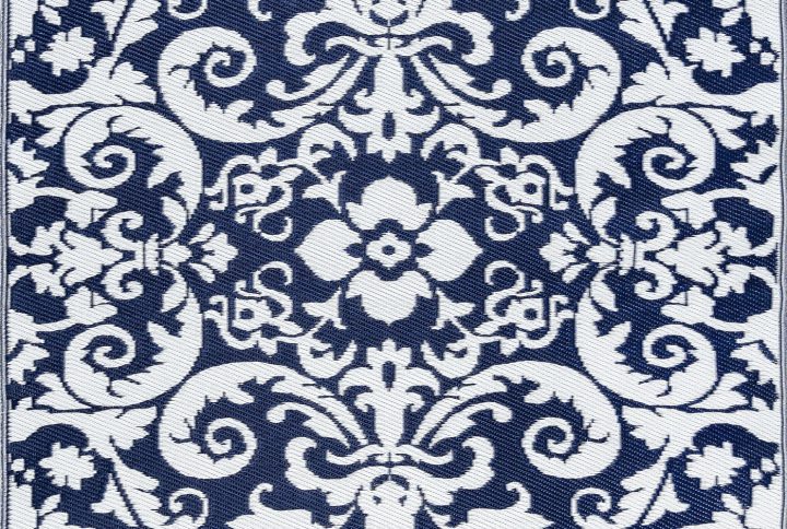 Filigree scroll with fleur de lis pattern adorns this indoor outdoor area rug that is a great fit in any room. Built to achieve and treated with UV resistance to stay vibrant. Perfect for a family room, sunroom, porch, deck, den, living room, playroom, nursery. May be cleaned outside with mild detergent and garden hose, allow to dry thoroughly. Spot clean with mild detergent and water when necessary.