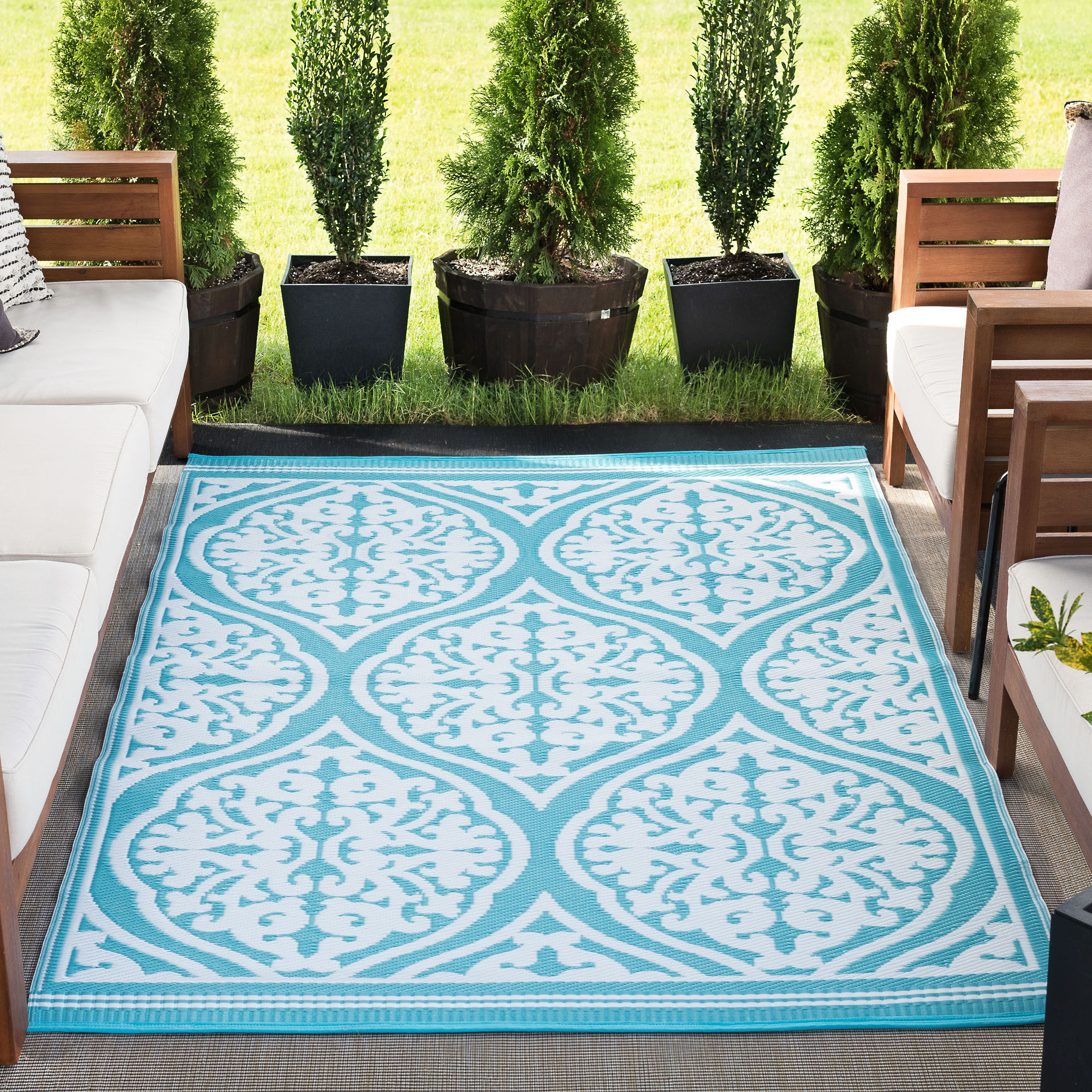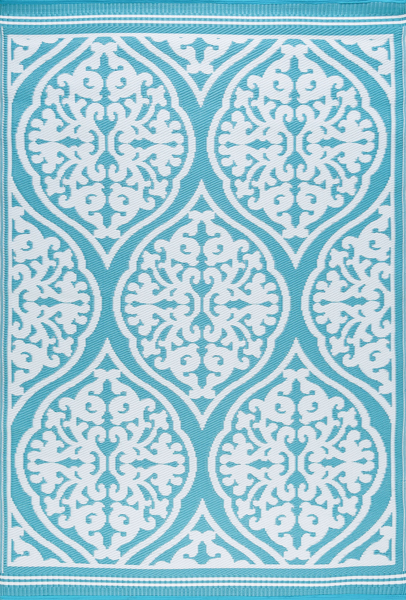 This ornate damask pattern indoor outdoor area rug adds a touch of refinement to any space. Built to achieve and treated with UV resistance to stay vibrant. Perfect for a family room, sunroom, porch, deck, den, living room, playroom, nursery. May be cleaned outside with mild detergent and garden hose, allow to dry thoroughly. Spot clean with mild detergent and water when necessary.