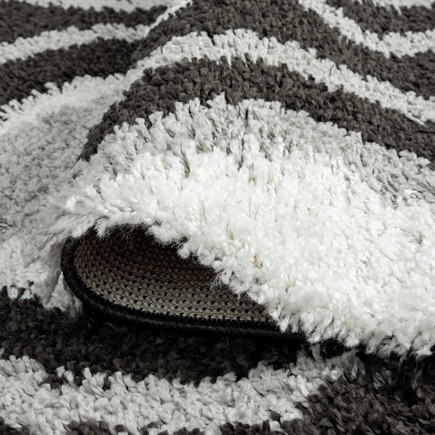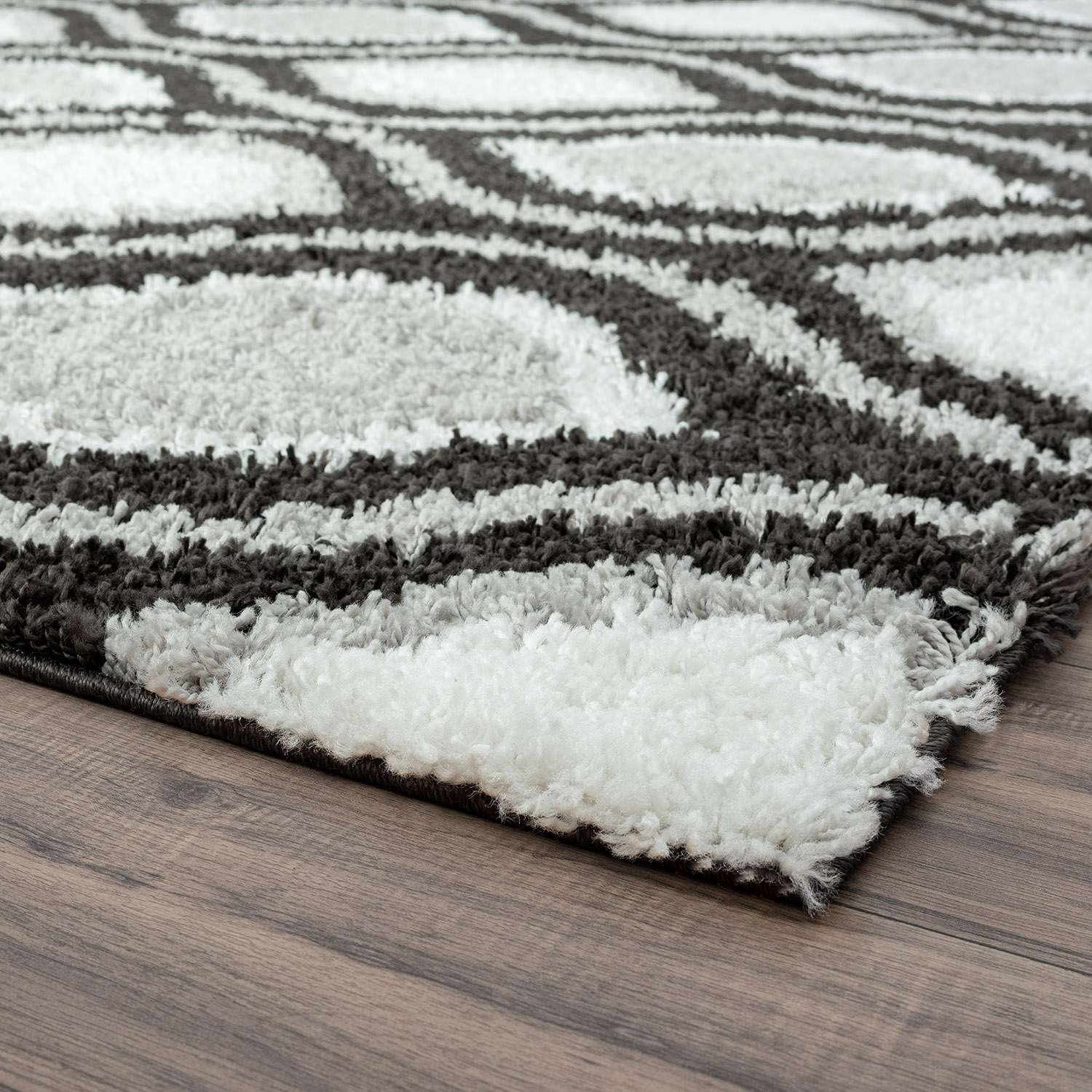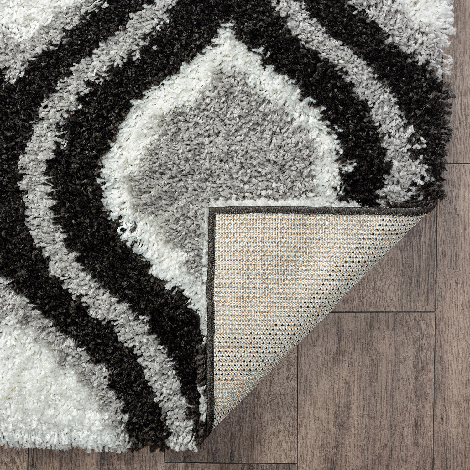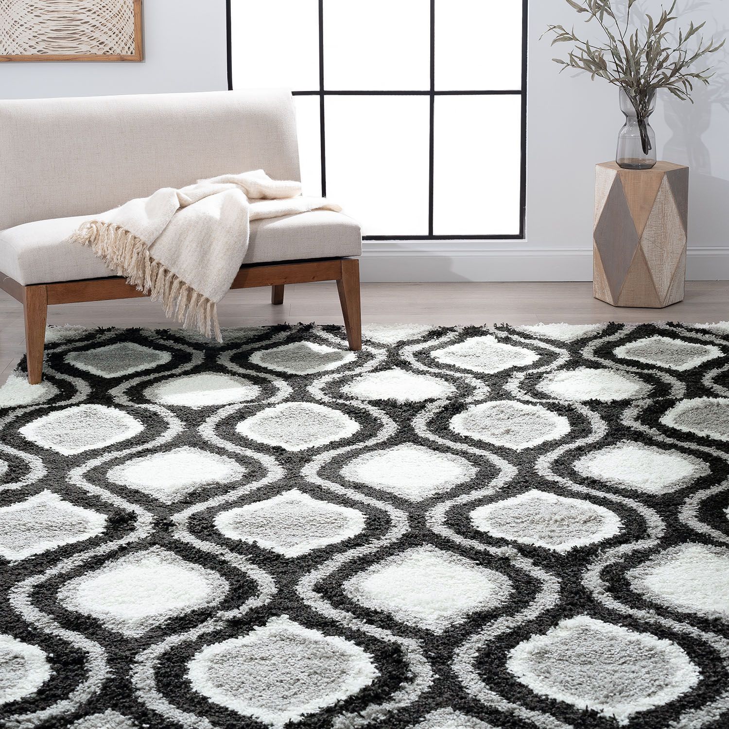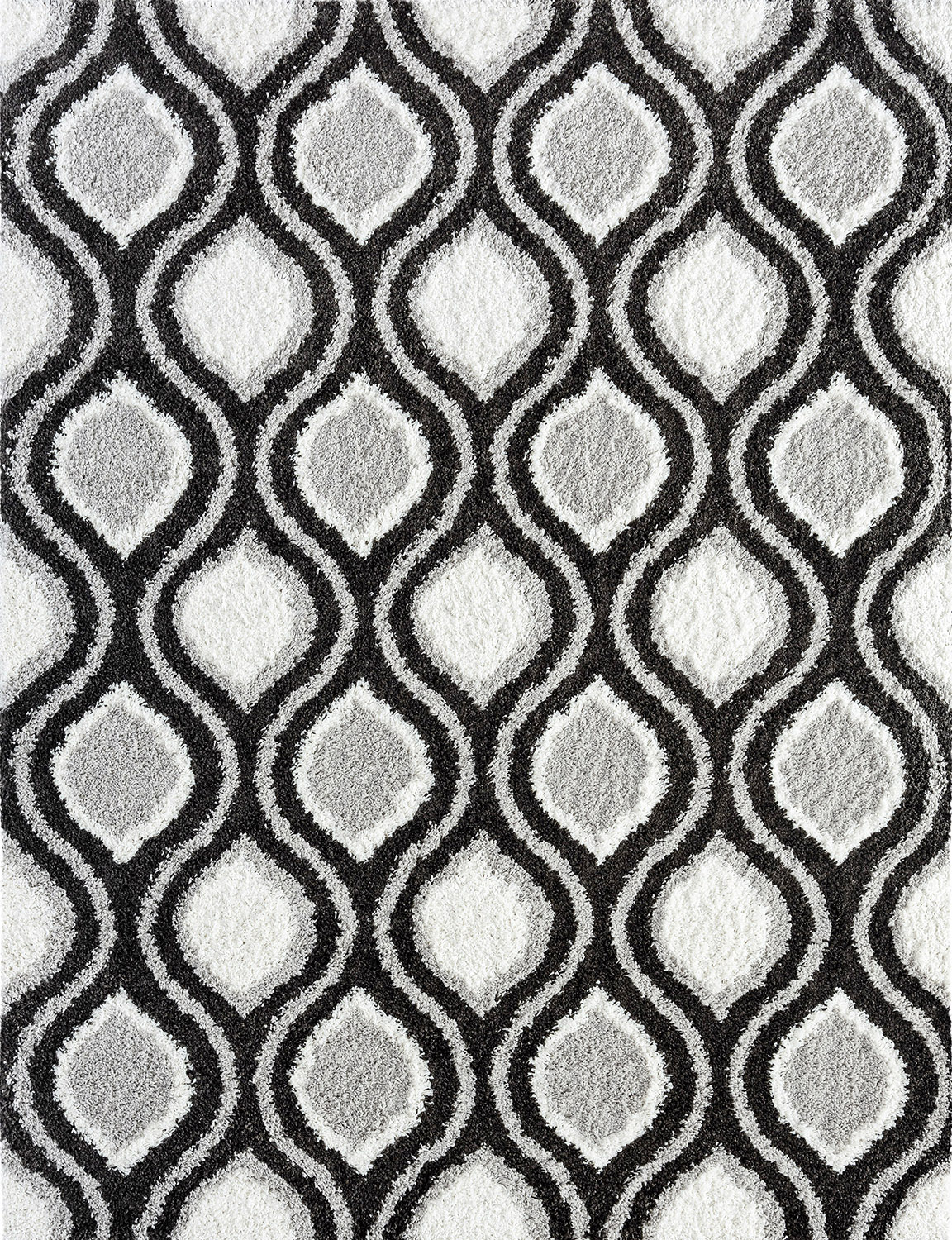 A sophisticated geometric pattern sets the stage for hi-fashion with this contemporary ogee indoor shag area rug. Mid-century modern style has a vintage feel that is retro and fun. Vacuum on high pile setting with no beater bar to remove debris taking care to avoid fraying the edges. Rotate periodically to extend the life of your investment.