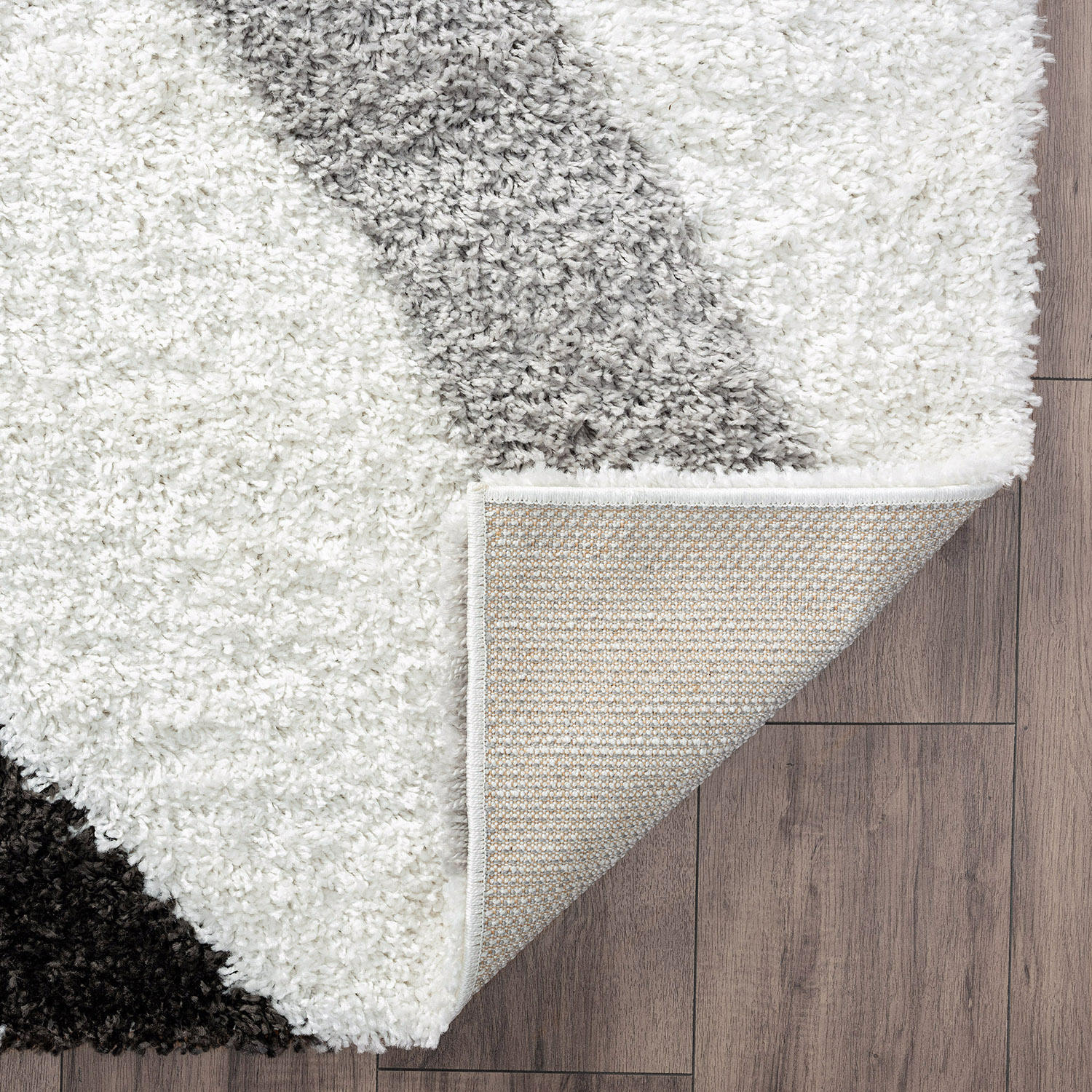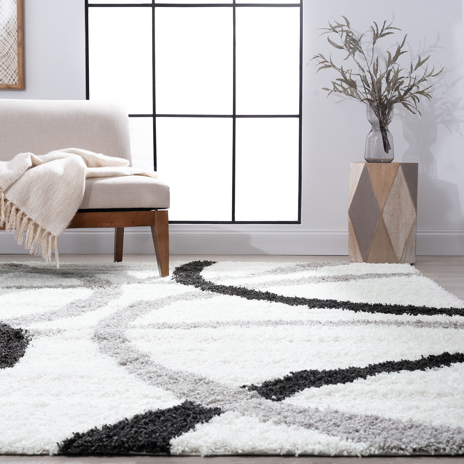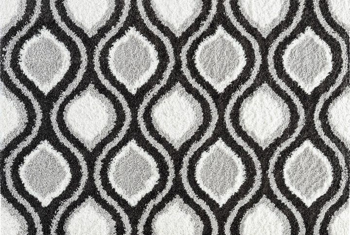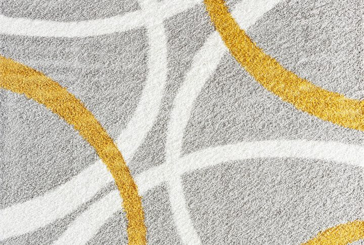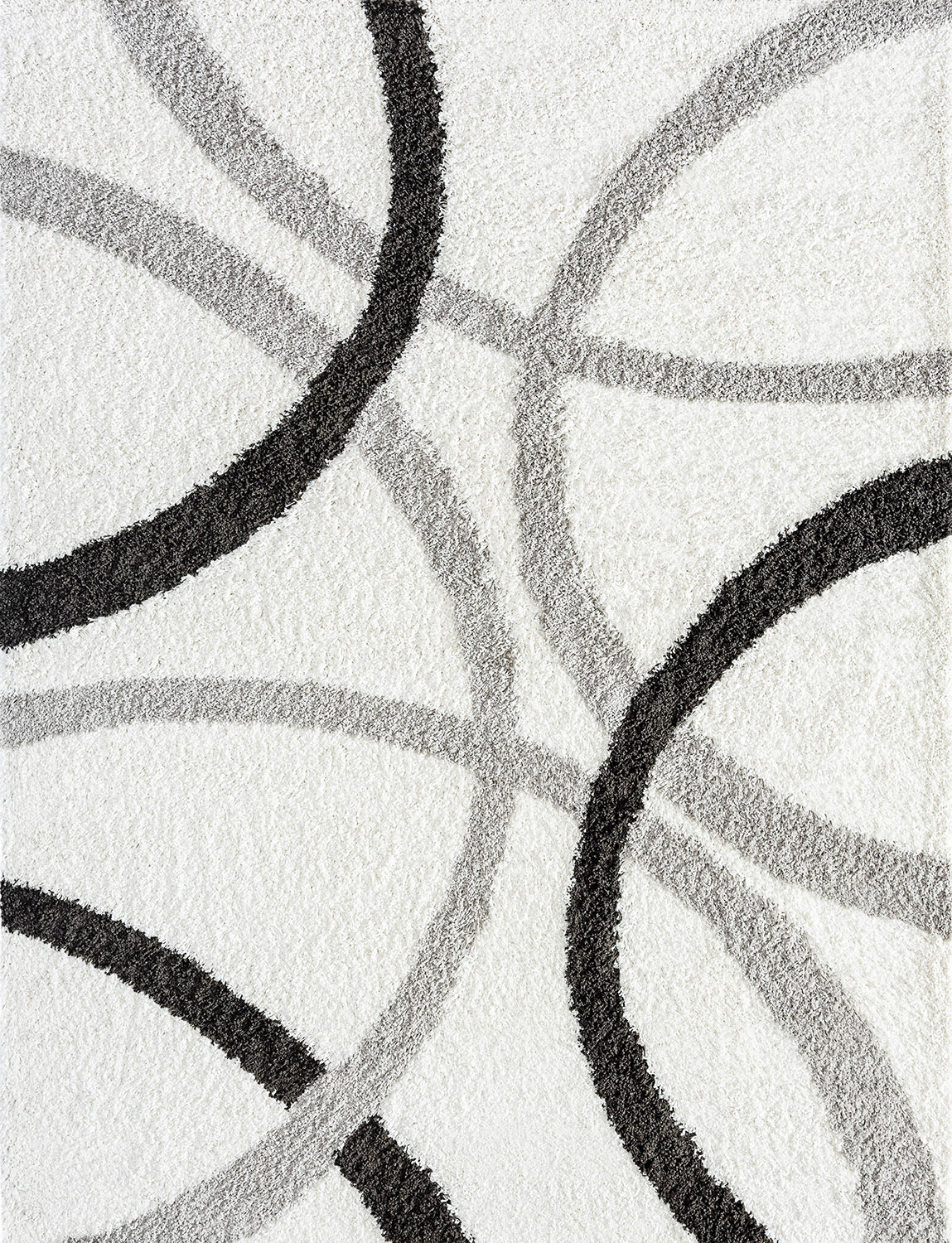 The abstract geometric pattern of deconstructed ribbon circles is a stunning design for this indoor shag area rug. The modern feel is a fresh update for traditional decor as well. Vacuum on high pile setting with no beater bar to remove debris taking care to avoid fraying the edges. Rotate periodically to extend the life of your investment.