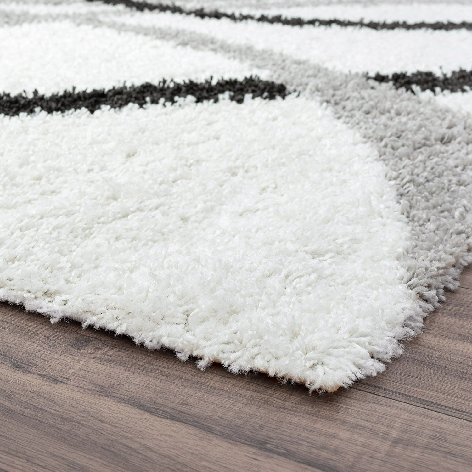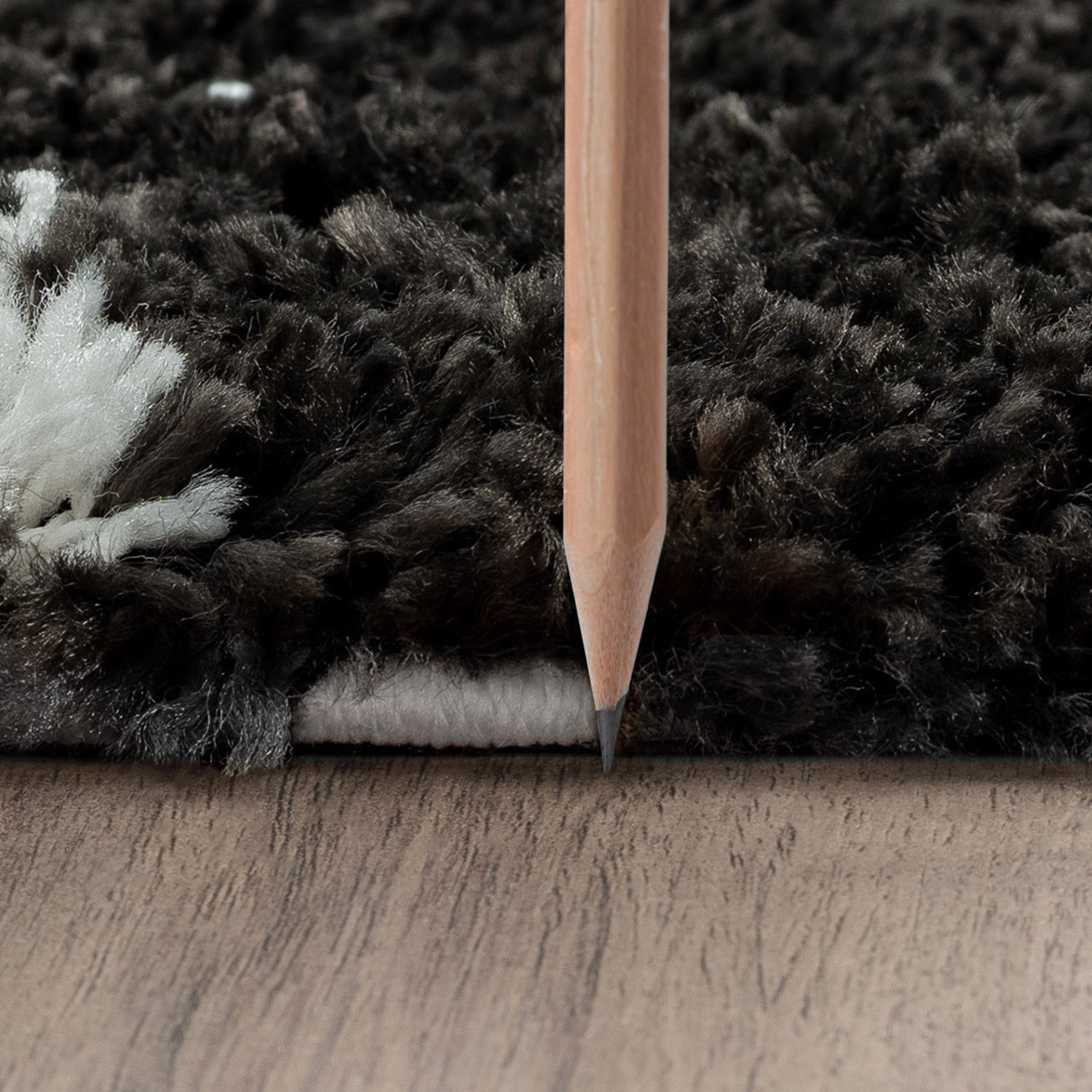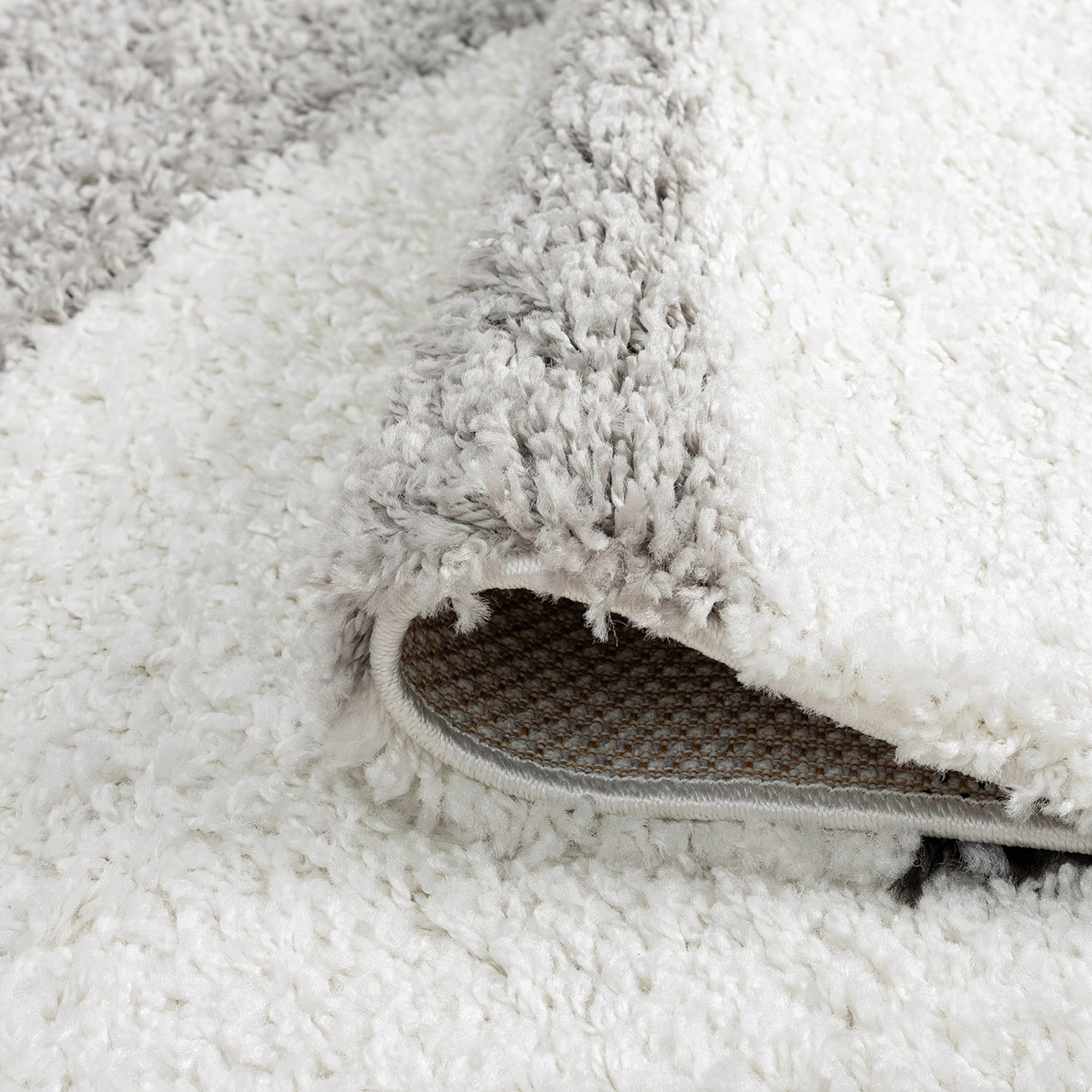 The abstract geometric pattern of deconstructed ribbon circles is a stunning design for this indoor shag area rug. The modern feel is a fresh update for traditional decor as well. Vacuum on high pile setting with no beater bar to remove debris taking care to avoid fraying the edges. Rotate periodically to extend the life of your investment.