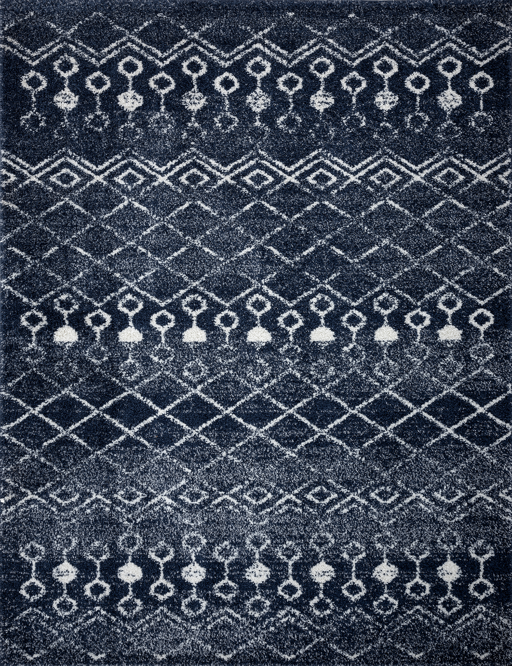 This trendy native tribal pattern has been tranlsated into an ultra soft shag area rug with boho charm. The 80% polypropylene, 20% polyester yarn feels plush underfoot. An artisan addition to Farmhouse, Contemporary, Scandinavian, Moroccan, and many other decorating styles. Jute backing offers durability and the fibers are naturally stain resistant to keep it looking fresh for many years to come. Vacuum on highest pile setting to remove debris, taking care not to catch the edges in the beater bar. Spot clean when necessary with mild detergent and water.